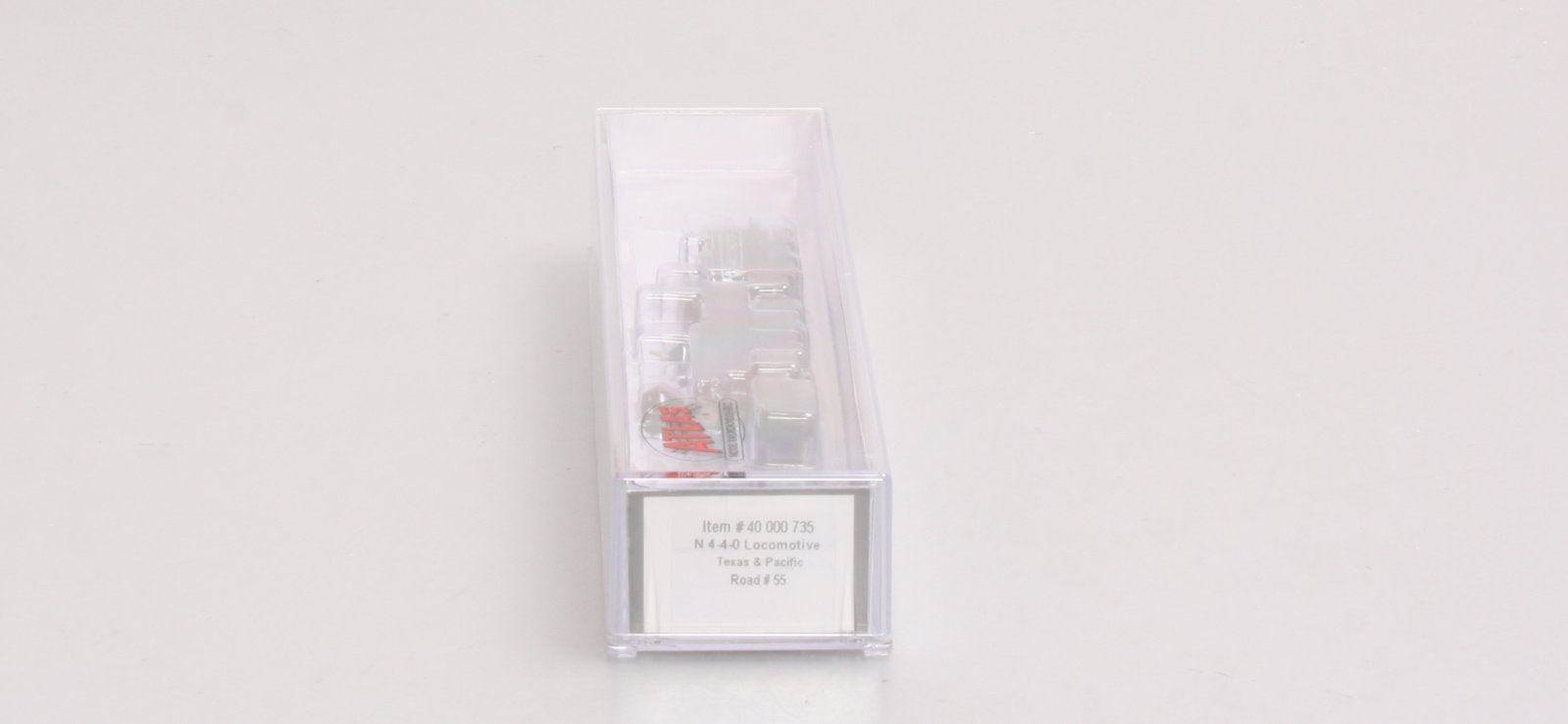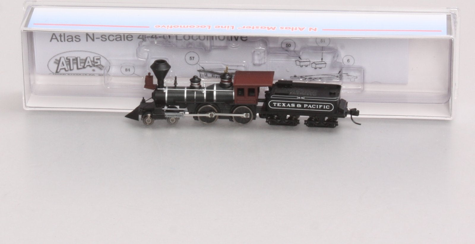 Here is an Atlas 40000735 N Scale Texas & Pacific 4-4-0 Steam Locomotive #55. This steam locomotive features plastic construction, metal wheels, couplers, powerful motor & lighting. Please check the photos for a detailed look at this item.