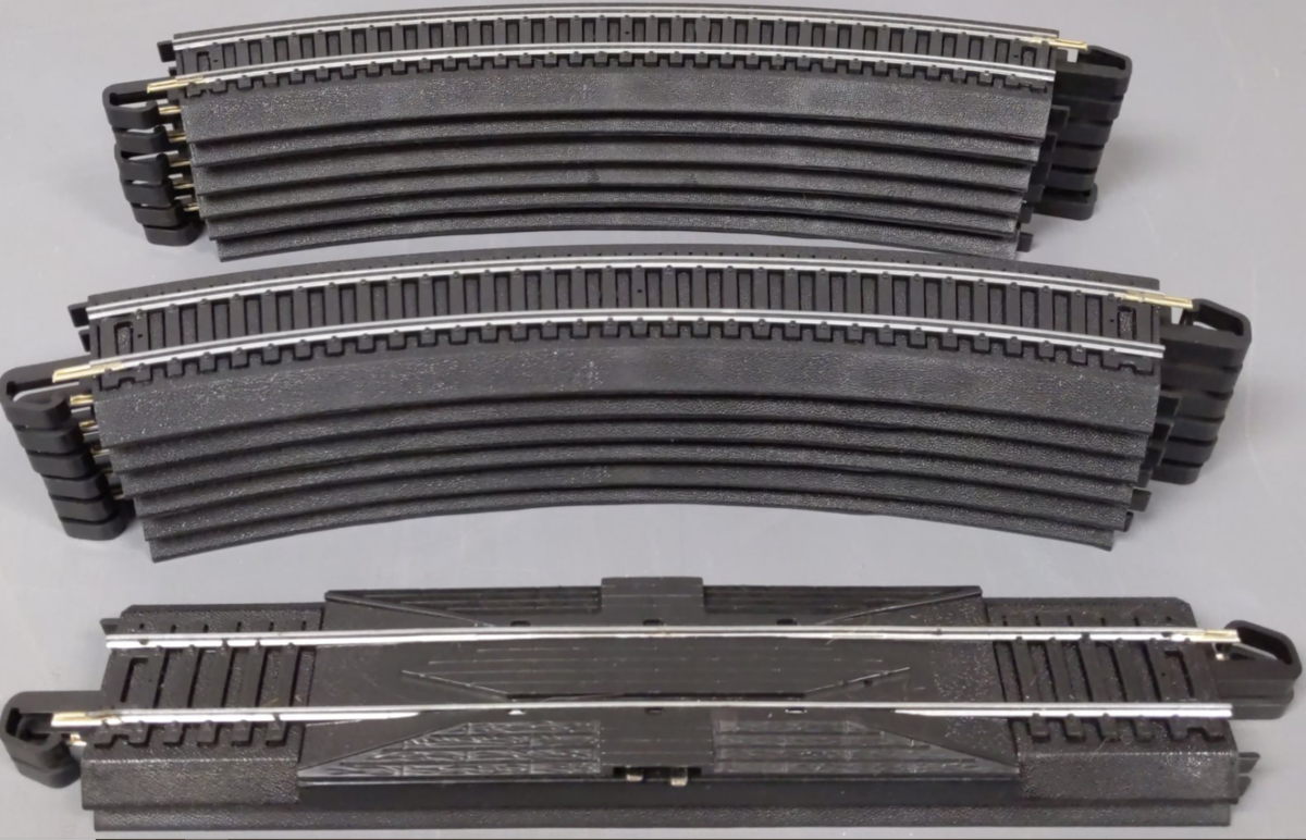 Here is a Bachmann 00610 HO Scale Galaxy Electric Train Set. This set includes: [1] Locomotive, [3] Freight Cars, [12] Curved Track Sections, [1] Straight Track Section [1] Rerailer and a Transformer. The cars feature plastic construction, horn-hook couplers and plastic wheels. The locomotive features metal wheels and a motor. Track sections feature plastic roadbed construction and metal rails.