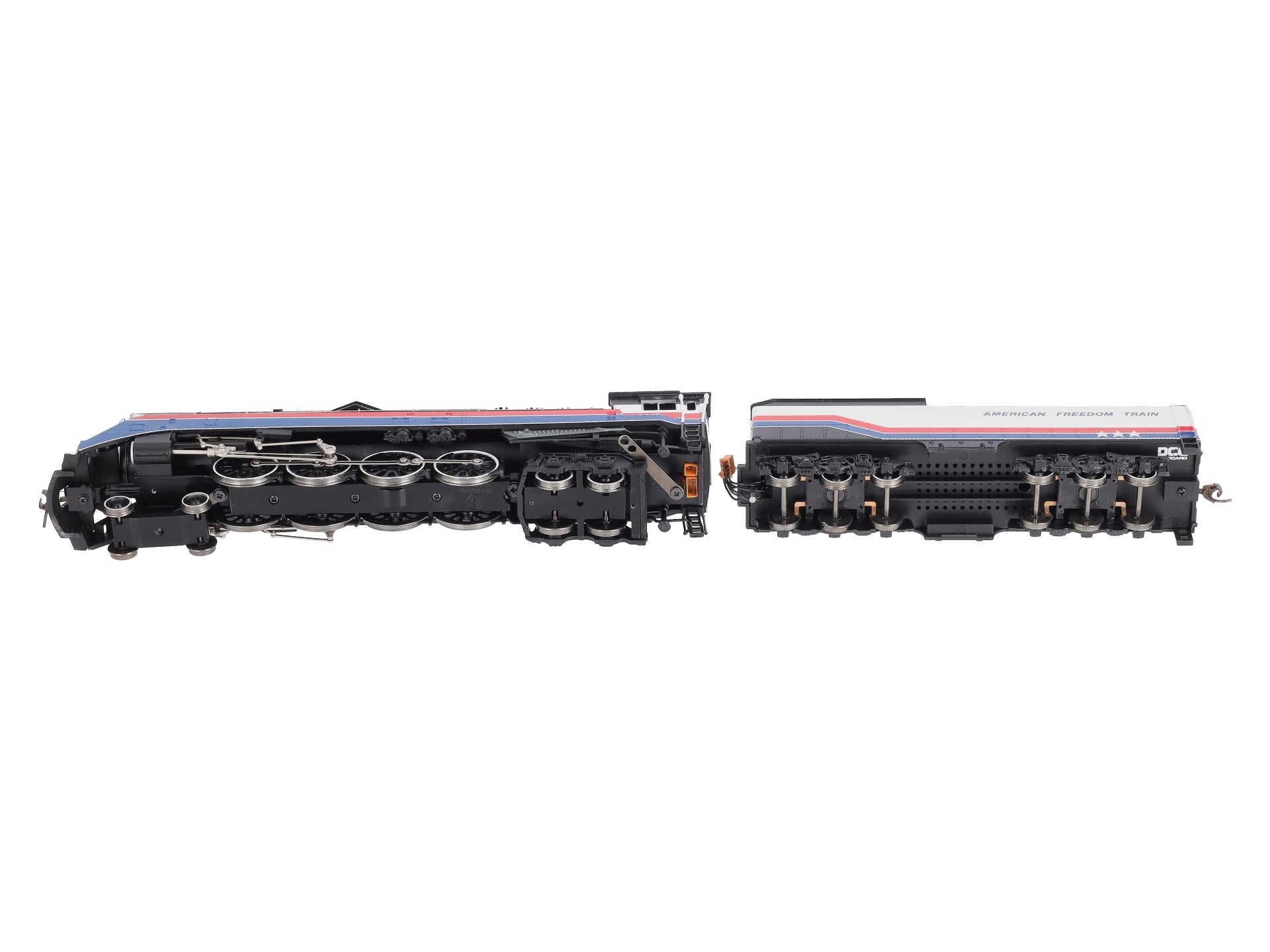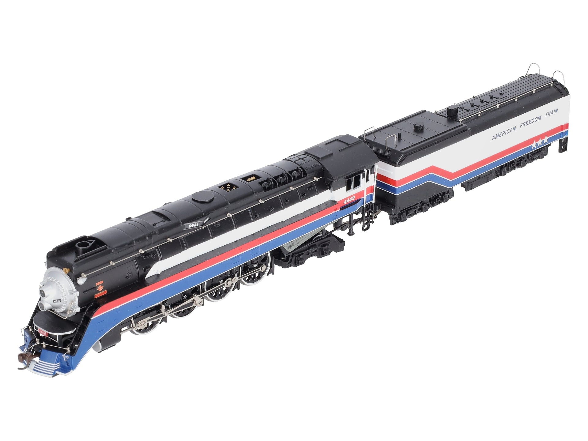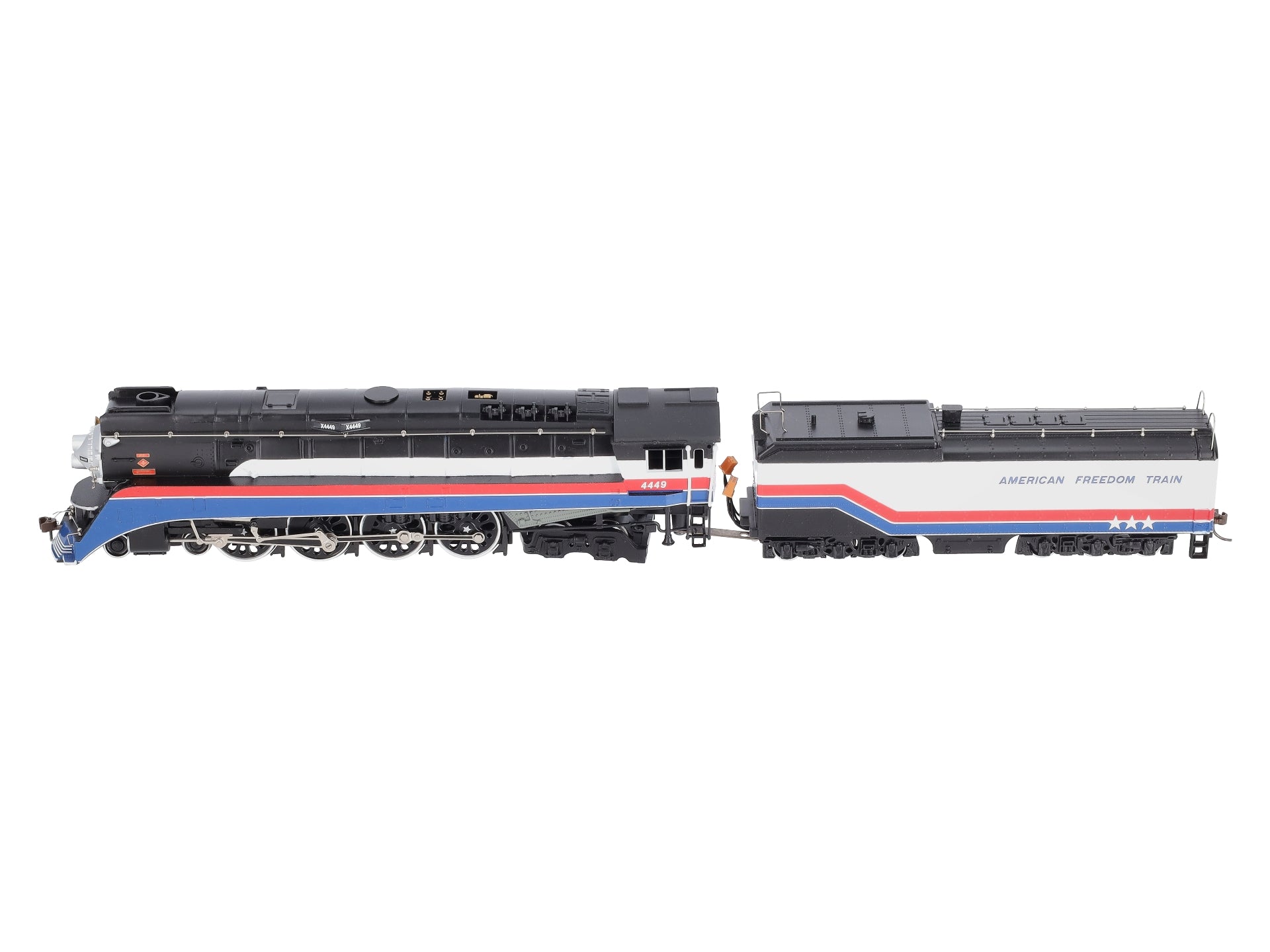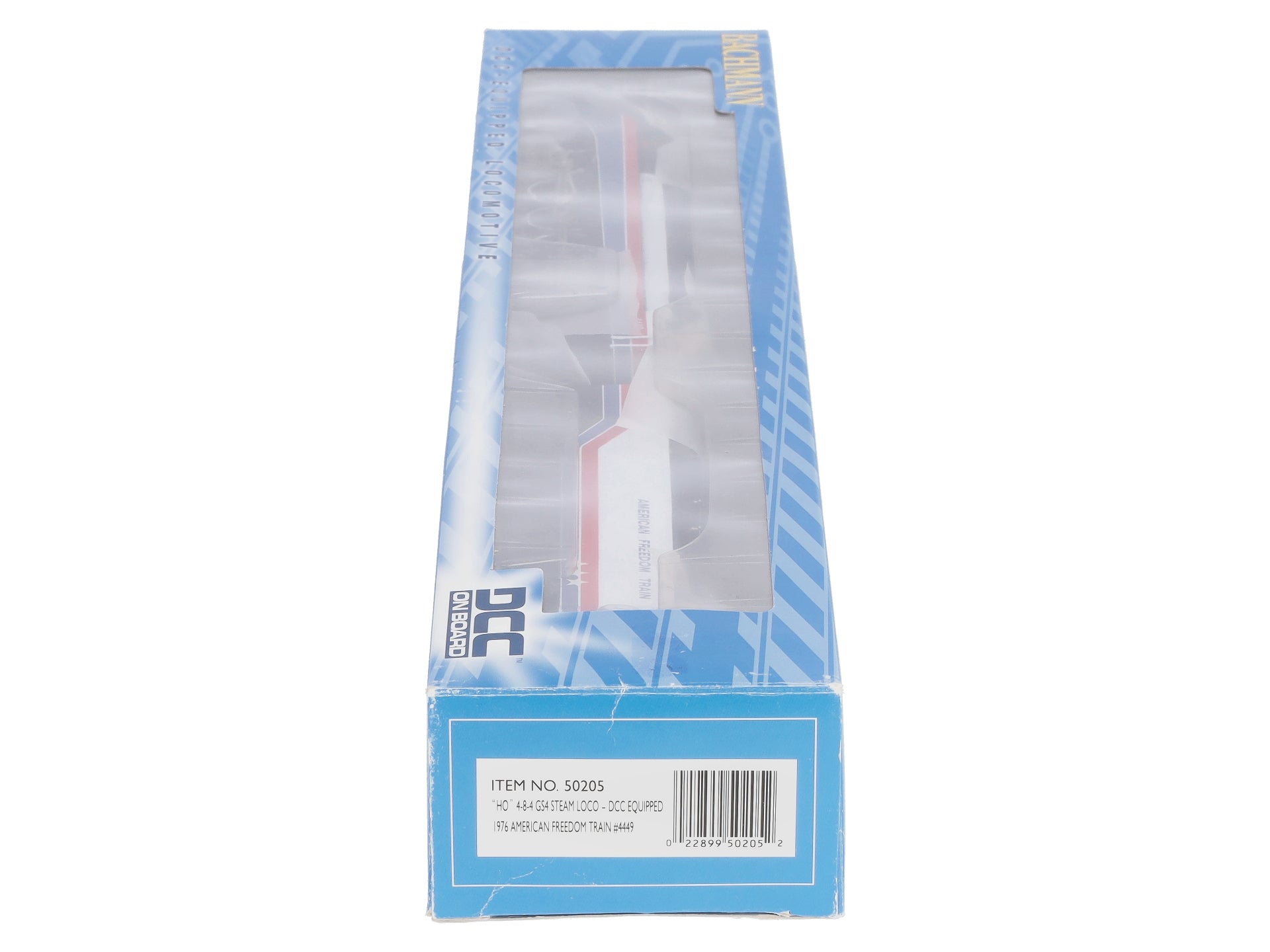 This is Bachmann 50205 HO American Freedom Train GS4 4-8-4 w/DCC Steam Locomotive #4449. Features includes DCC equipped model has all-metal chassis, five-pole motor, worm gear and flywheel drive plus operating headlights and E-Z Mate couplers, DCC equipped model has prepainted plastic body in color red, white, blue, black.