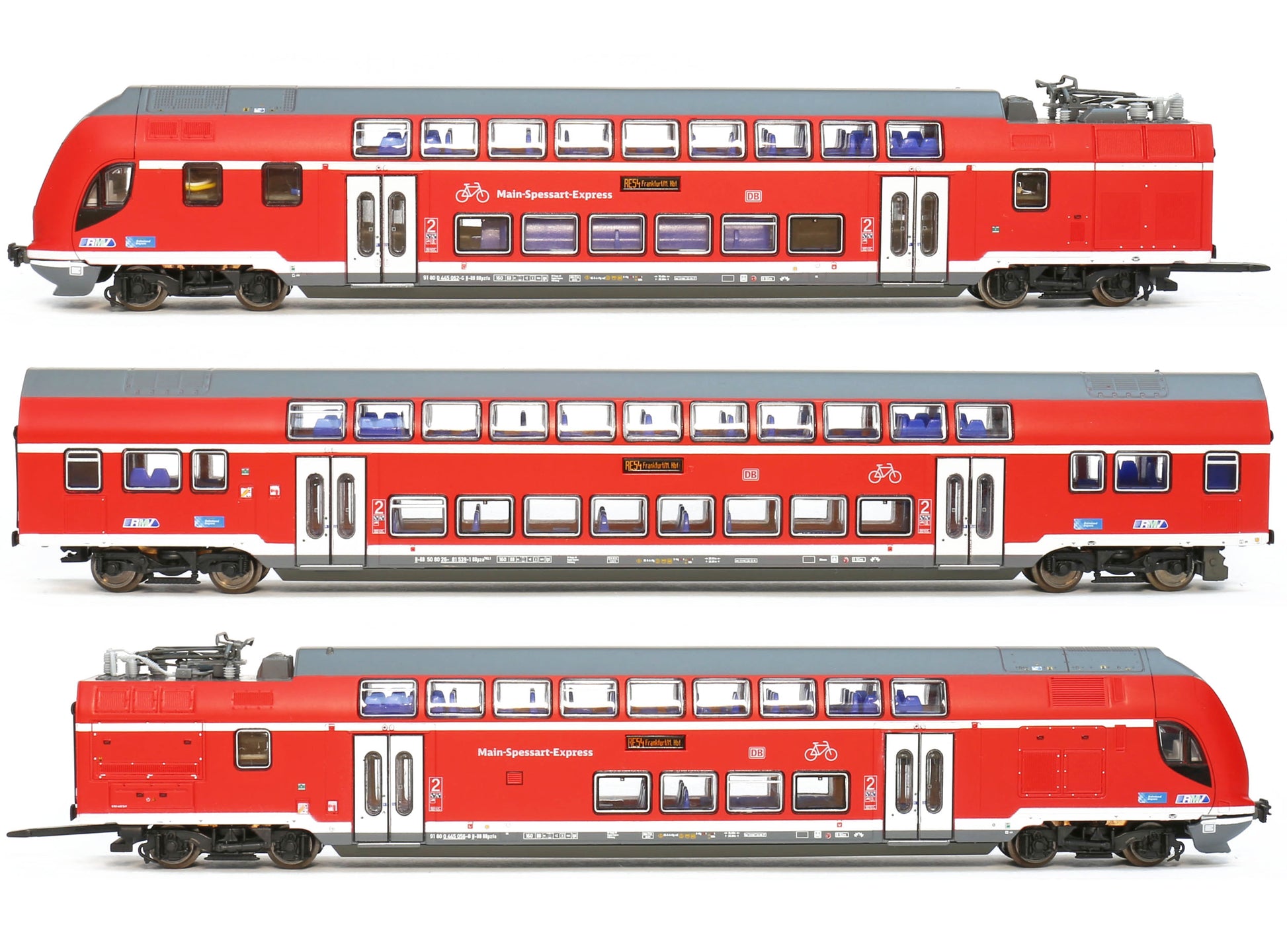 This is a Brawa 64500 N Scale DB AG Twindexx Vario Double-Deck Railcar (Pack of 3). It features: True-to-original length over buffer, Structure made of high-quality, impact-resistant plastic, Metal bottom plate, Printed window frames, In-plane assembled windows, Illuminated destination indicator (digital), Lighting with warm white LEDs, Long-distance headlights (digital), True-to-scale details, Perfectly replicated three-dimensional front, Finely engraved details, Finest paintwork and printing, Illuminated driver's cab, With interior fittings, incl. driver's cab, NEM-standard close coupling, Lights change white/red, in the direction of travel, For digital operation, decoder (order no. 99821) are required for each individual vehicle (Operating the vehicle without decoder in digital mode can result in damage to the electronics).
