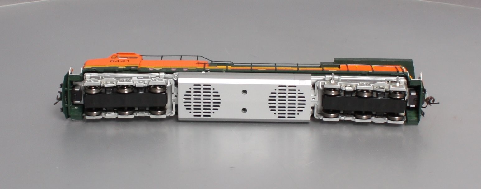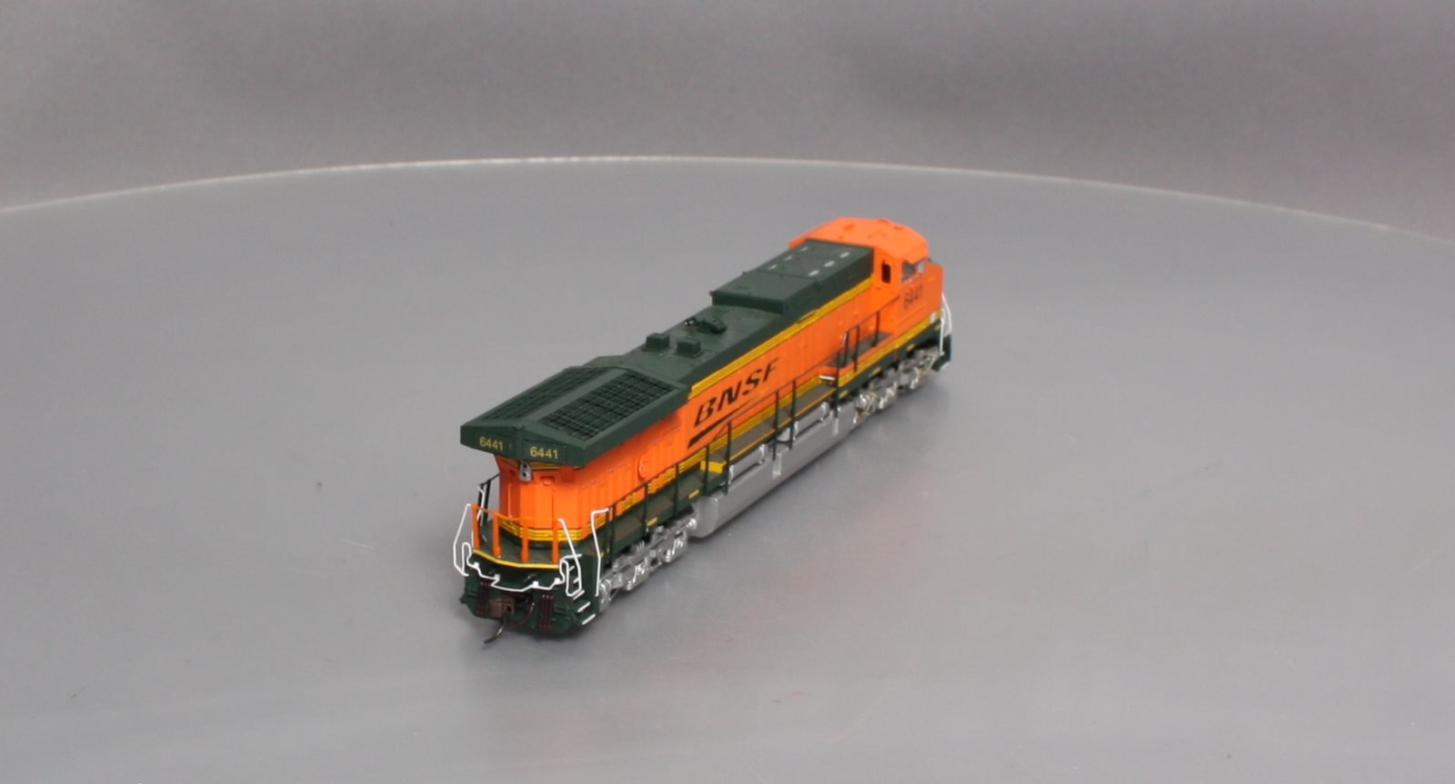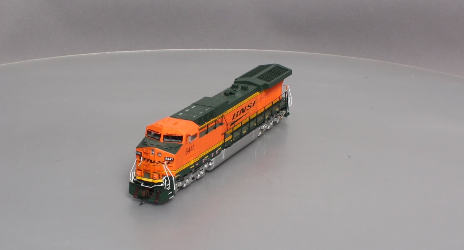 This is a Broadway Limited 2464 HO Scale BNSF Railway GE AC6000CW with Sound & DCC - Paragon2™ #6441 (orange, black, Wedge Logo).Industry,Leading Features: All New Paragon2 Sound and control system, Integral DC/DCC dual mode decoder for ease of operation, Industry best slow,speed operation in DC and DCC, Prototypical light operation with headlight, rear light, and operating ditch lights, Authentic GE AC6000 Sounds! Controllable in DC and DCC., All,wheel drive and All,wheel electrical pick,up, Operating knuckle couplers, Factory instAlled engineer and fireman figures, Near brass,caliber detail at a plastic price. Product Information: ABS plastic body with heavy die cast chassis for maximum tractive effort, Single unit pulls equivalent of 60 freight cars on level surface, 5,pole can motor with skew wound armature, Locomotive Length (coupler to coupler): 10 inches, Locomotive Weight: 1 lb 10 oz, Separately Applied Handrails, Ladders, Whistle, and Brass Bell, Will Operate on Code 70, 83, and 100 rail, Recommended Minimum Radius: 18 inches.
