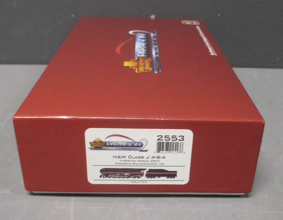 This is a Broadway Limited 2553 HO Scale Norfolk & Western Class J 4-8-4 with Sound & DCC - Paragon2™ #607 (black, maroon). The famed N&W J Class is on its way back to the Broadway Limited Imports lineup for late 2012 with a Newly refined mechanism and the Sound and power of the New Paragon2 control system! Our 2012 N&W J Class locomotive is sure to please with authentic J Class Sounds, super silky operation and stunning paint and finish. Add to All of that synchronized Puffing Smoke and you truly have an All-star for any N&W pertinent layout! As always, BLI locomotives are limited run and delivered on a first come, first served basis.Industry-Leading Features: All-New Paragon2 Sound & Control System,Synchronized Puffing Smoke with Chuff Sound,Variable Puffing Smoke Intensity and timing,Integral DCC Decoder with Back EMF for Industry Best Slow Speed Operation in DC and DCC,Precision Drive Mechanism engineered for continuous heavy load towing and smooth slow speed operation,5-Pole Can Motor with Skew Wound Armature,Premium Caliber Painting with Authentic Paint Schemes,Prototypical Light Operation with Golden White LED Headlight, Rear Light,Factory InstAlled Engineer and Fireman Figures,Near-Brass Caliber Detail at a Plastic Price. Product Information: ABS Body with Heavy Die Cast chassis for Maximum Tractive Effort,Metal Kadee-compatible Couplers (2),All-Driver Drive and All-Wheel Electrical Pick-up except for pilot trucks/trailing trucks,Separately Applied Handrails, Ladders, Whistle, and Brass Bell,Will Operate on Code 70, 83, and 100 rail,Recommended Minimum Radius: 18 inches,Accurate prototypical Sounds for the N&W J.