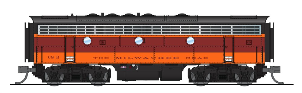 This is a Broadway Limited 3525 N Scale Milwaukee EMD F7B Maroon Band on Orange Scheme Paragon3 Sound/DC/DCC #68B. Industry-Leading Features: NEW Paragon3 Sound & Operation System FEATURING ROLLING THUNDERTM with Authentic Sounds and Prototypical Operation in both DC and DCC environments, Integral DCC Decoder with Back EMF for Industry Best Slow Speed Operation in DC and DCC, Precision Drive Mechanism engineered for continuous heavy load towing and smooth slow speed operation, Premium Caliber Painting with Authentic Paint Schemes and Prototypical Light Operation with Golden White LED Headlight, Rear Light. Product Information: ABS Body with Die Cast chassis for Maximum Tractive Effort, (2) Operating MicroTrains #1015 or Compatible Couplers, Separately Applied Handrails, Ladders, Whistle, and Brass Bell, Will Operate on Code 55, 70, and 80 Rail and Recommended Minimum Radius: 9.75 inches. Industry-Leading SOUND Features: Operates in DC & DCC (use DCMaster for DC Sound), Record & Play Operation - Records and plays back sounds and movements once or repeatedly for automatic operation, 16-bit Sample Rate for exceptional high frequency sound clarity, Alternate Whistle / Horn where applicable for locomotive with air horn and steam whistle - both the main whistle and alternate can be easily played, Adjustable bell ringing interval for faster or slower bell, Numerous user-mappable functions with available keys, Passenger Station Ambient Sounds - Controlled with Function Key, Freight Yard related radio chatter - Controlled with Function Key, Lumber Yard Ambient Sounds - Controlled with Function Key, Farm related radio chatter - Controlled with Function Key, Crew Radio Communications - Controlled with Function Key, Maintenance Yard related radio chatter - Controlled with Function Key, Demo Mode for display and demonstrations, Simple Programming with Integral DCC Decoder and Individually adjustable sound volumes for most effects.