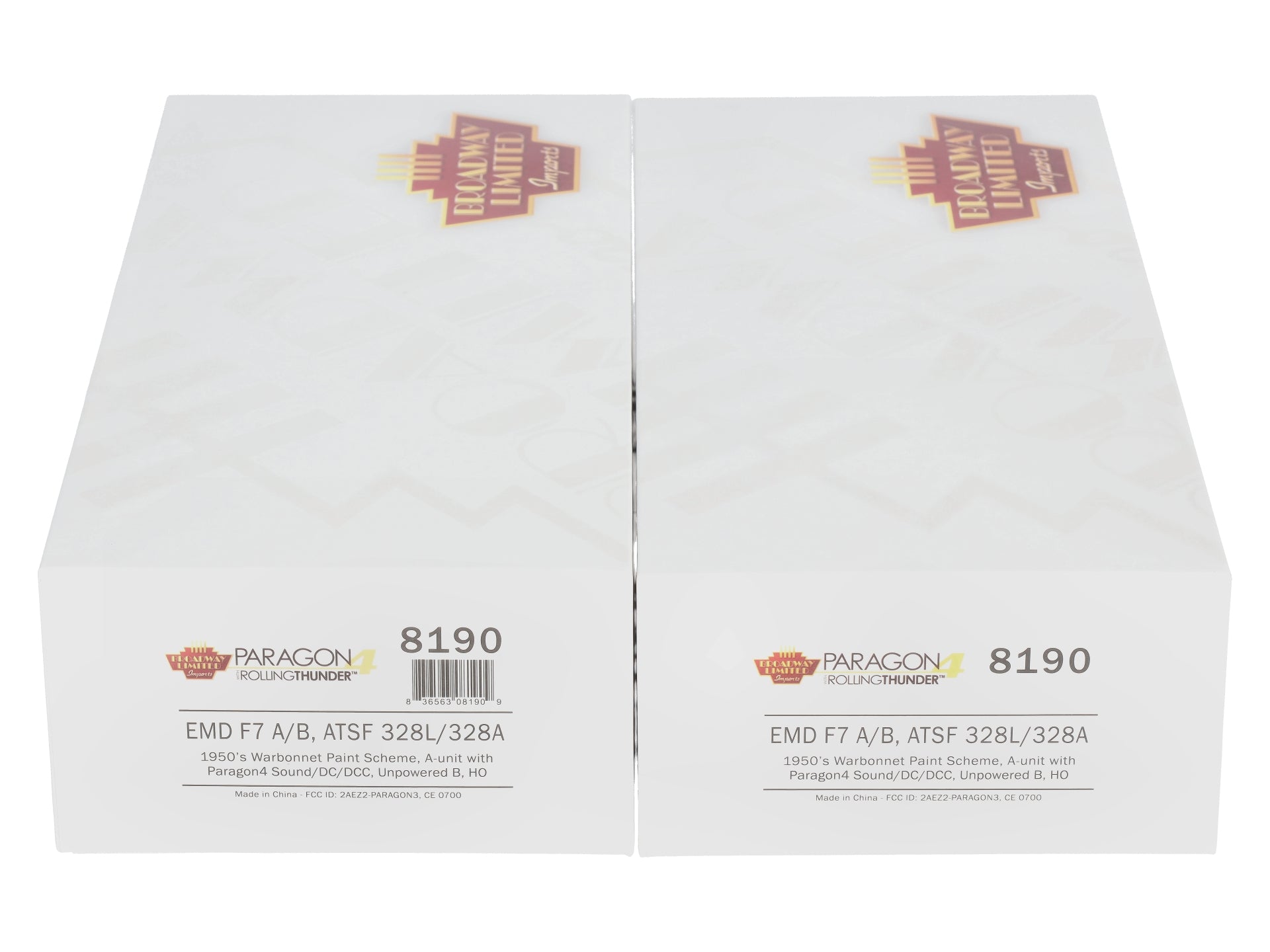 This is a Broadway Limited 8190 HO ATSF EMD F7 A/B Diesel Locomotive P4 Sound/DC/DCC #328L. Model Features: Paragon4 Sound & Control System featuring ROLLING THUNDER, Integral Dual-Mode Decoder with Back EMF for Superb Slow Speed Operation in DC and DCC, Precision Drive Mechanism Engineered for Heavy Towing and Smooth Slow Speed Operation, All Wheel Electrical Pick-up, ABS Body with Die Cast Chassis for Maximum Tractive Effort, Premium Caliber Painting, Prototypically Accurate Paint Schemes and Road Numbers, Many Separately Applied Details such as Handrails, Grab Irons, Horn, Bell, Wipers, and Etched Metal Grills, Prototypical Light Operation, Prototypically Accurate Sounds for the EMD F7 Diesel Locomotive, Metal Kadee-compatible Couplers (2), Will Operate on Code 70, Code 83, and Code 100 Rail, Minimum Operating Radius: 18 inches.