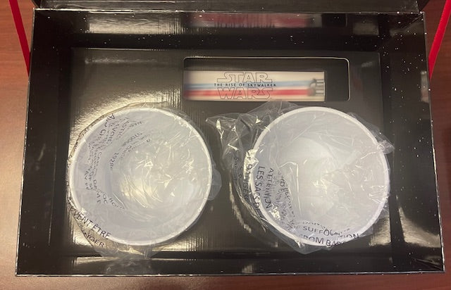 This is a Disney Movie Club Star Wars: Rise of Skywalker Special Edition Movie Box. Includes backpack, two (2) slouchy beanies, two (2) popcorn bowls, two (2) exclusive pins, two (2) straws, metal lithograph, lanyard and badge.