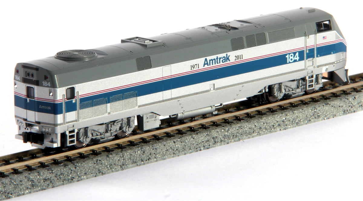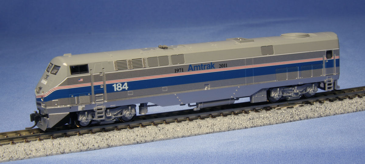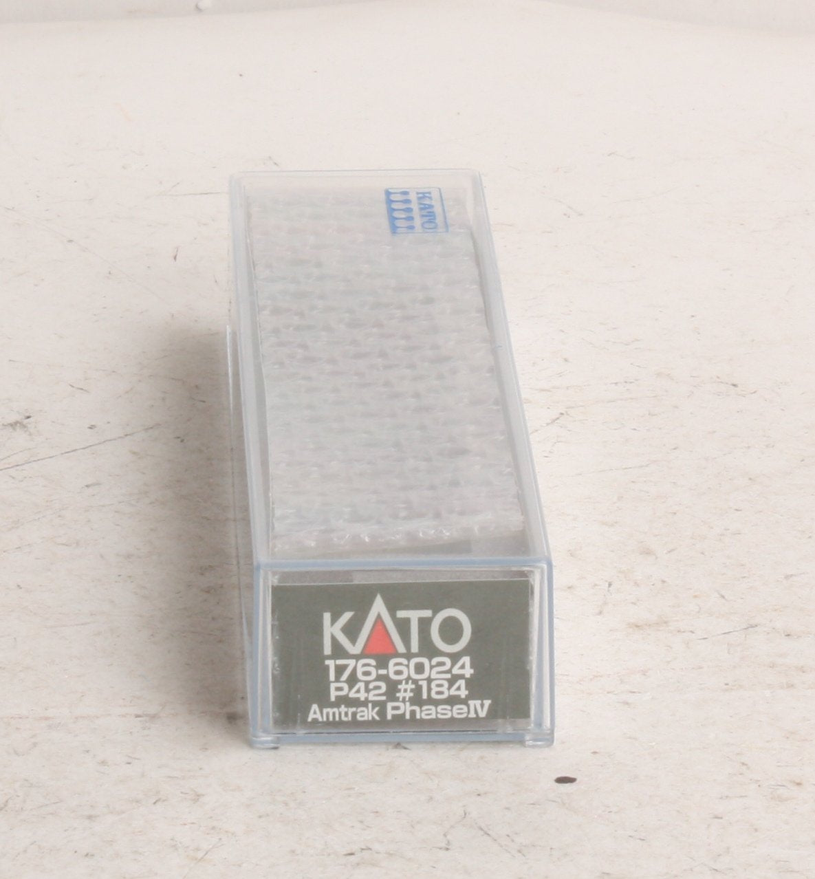 This is Kato 176-6024 N P42 Amtrak 40th Anniversary PhIV #184. Amtrak 40th Anniversary Phase IV General Electric P42 Genesis is a modern 4,200 horsepower passenger locomotive used across the United States and Canada. Amtrak's P42 has replaced the EMD F40PH in revenue service and today they are used throughtout the United States and often operated in a mixed consist of Phase IV and Phase V schemes.