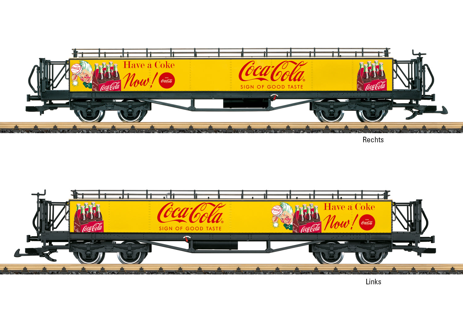 This is an LGB 32356 G Coca-Cola Observation Car. This is an model of an open observation car. It is a version in the Coca-Cola paint scheme for Era III. The car has finely detailed interior details with a bar. It also has metal wheelsets. Length over the buffers 58 cm / 22-13/16. This car is the ideal add-on to go with the 36812, 36818, 36847, and 40757 passenger cars.
