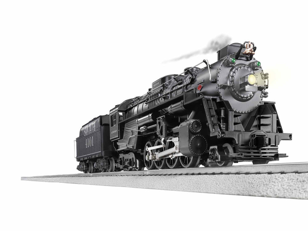 This is a Lionel 1932010 O Scale Santa Fe LionChief Plus 2.0 Berkshire Steam Locomotive #4101. It features: LC+ 2.0 Control - operate with Bluetooth™ using Universal Remote or LionChief® App on your smart device OR via your TMCC/LEGACY® Cab OR conventional transformer, Die-cast boiler, frame, tender body, Powerful maintenance-free motor, Speed control, Fan-driven smoke, LED Headlight, ElectroCoupler on tender, Flickering Firebox, Cab light, Crew figures, Numberboards, Directional Lighting, Marker Lights, Four Chuffs/Revs, Volume Control, Background Sounds & Whistle/Horn. LEGACY® RailSounds® sound system featuring: CrewTalk™ dialog and TowerCom™ announcements, each with different scenarios depending on whether the locomotive is in motion or stopped, Six official railroad speeds with CrewTalk dialog, Eight diesel RPM levels, LEGACY® Real-Time Quilling Horn control with instant response for realistic signature quilling and correctly timed warning signals, Single hit or continuous mechanical bell sounds, Sequence Control: plays the sound effects of an entire trip, including warning sounds and announcements, based on the movement and speed of the locomotive, Current speed and fuel dialog, refueling sound effects.