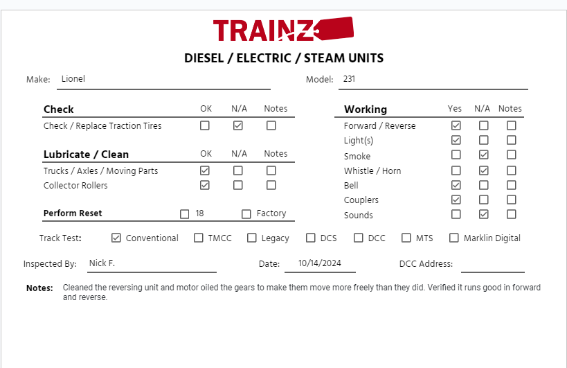 items. Once Trainz receives and inspects the items we will repair your item or issue a refund.