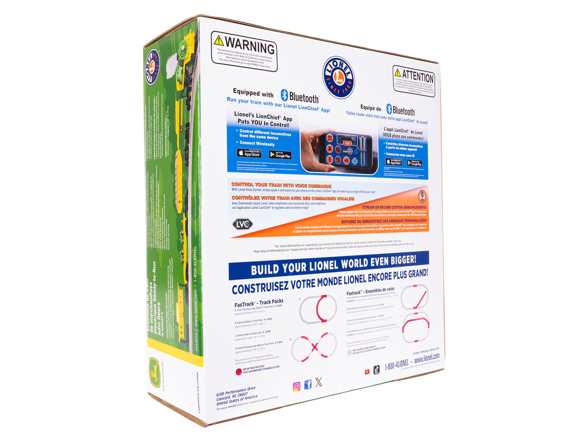 This is a Lionel 2423070 John Deere O Gauge LionChief BT 5.0 Steam Freight Starter Set. SET INCLUDES: 2-4-2 Locomotive & Tender, Fertilizer Hopper with Burlap Sack Load, Flatcar with Vintage Tractor Load, Caboose, Eight pieces of O36 curved FasTrack, Two FasTrack 10"" straight track sections, One LionChief FasTrack Terminal section, One Plug-Expand-Play Power Lock-on section, Wall-pack power supply, LionChief remote for locomotive, LOCOMOTIVE FEATURES: Electric locomotive controlled by included LionChief remote, LionChief Universal Remote (sold separately) or Bluetooth LionChief app, Lionel Voice Control (LVC) - run your locomotive by speaking commands into your phone via LionChief App, Voice Streaming & Recording (VSR) - record or live stream your own custom announcements via LionChief App, RailSounds RC sound system with steam chuffing and background sounds, whistle, bell, and user-activated announcements, Operating headlight, Powerful maintenance-free motor, On/Off switch for smoke and sound, Operating couplers, Puffing smoke, ROLLING STOCK FEATURES: Operating couplers, Simulated Burlap Sack Load in Hopper, 2 Vintage Tractors on Flatcar, LIONCHIEF REMOTE FEATURES: Forward and reverse speed control knob, Three buttons to activate whistle, bell, and special announcements, Requires three AAA alkaline batteries (not included), Gauge: O Gauge, Power: Electric, Engine Type: Steam, Dimensions: Length: 47"".