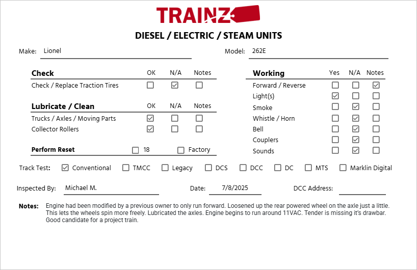 This item has been graded per TCA standards C-6: Very Good based on visual appearance. This item displays scratches and paint imperfections across the body and underframe. Spots of surface rust can be seen on the wheels and coupler. The underside and wheels of this item show moderate signs of wear from prior usage. This locomotive will only run forward and the tender is missing the drawbar. The original box is not included. The instruction manual is not included. This item has been inspected by our repair shop. Please see the attached picture for inspection details and additional operation information. Overall condition is Very Good.