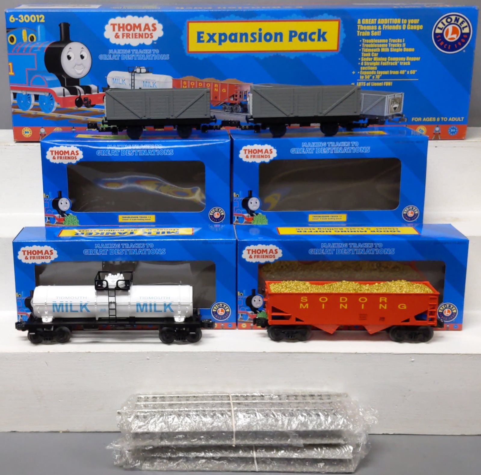 Here is a Lionel 6-30012 O Gauge Thomas & Friends Expansion Pack. Grow your Thomas layout at tremendous savings with the all-new Thomas Set Expansion Pack, featuring four of Thomas’ friends. The pack features Troublesome Truck I, Troublesome Truck II, Tidmouth Milk Single Dome Tank Car, Sodor Mining Company Hopper, Four straight FasTrack track sections, Expands layout from 40 inches x 60 inches to 50 inches by 70 inches. Cars feature plastic construction, knuckle couplers and metal wheels. Track sections feature plastic roadbed construction and metal rails.