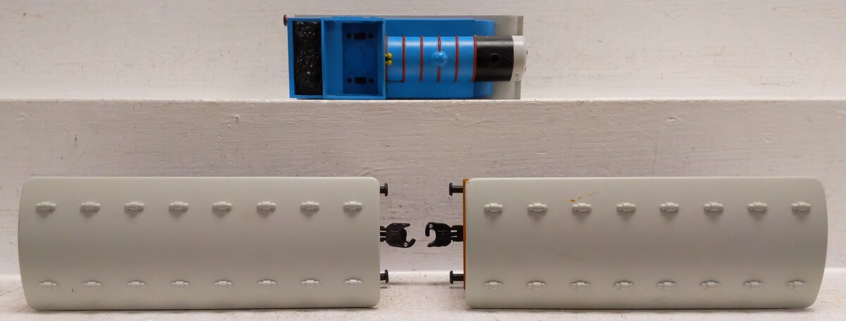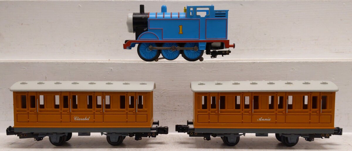 This item has been graded per TCA standards C-7: Excellent based on visual appearance. This set does not come with any accessories, tracks, or transformer. The Thomas locomotive is missing the roof trim piece. The coupler on the locomotive is broken. There is a paint mark on the roof of one the items. There are scratches and paint loss all throughout the shell and undercarriage of the items. The wheels show average run-time. The items show signs of previous use. The overall appearance of these items may be improved with a gentle and thorough cleaning. Overall condition is Excellent.