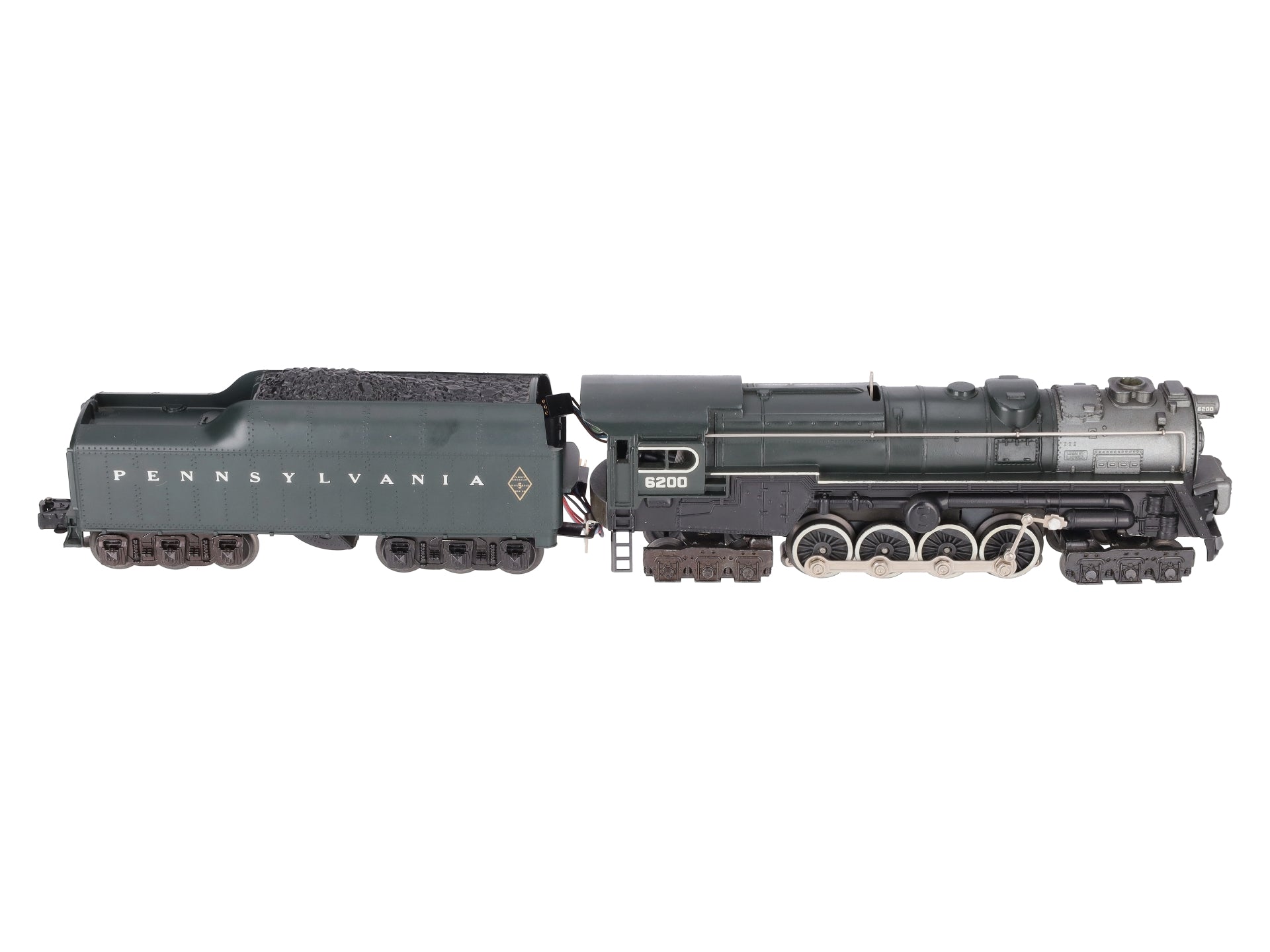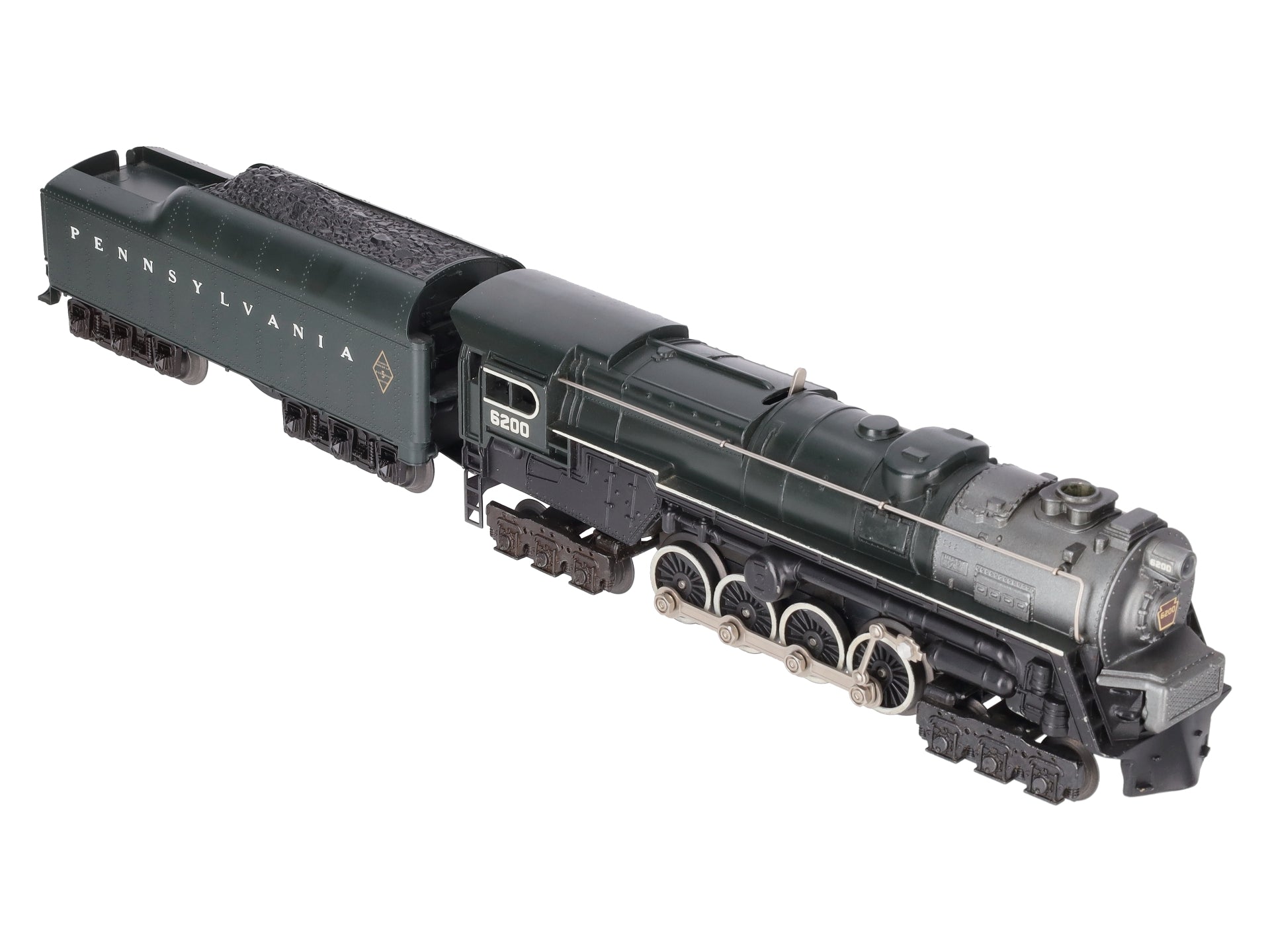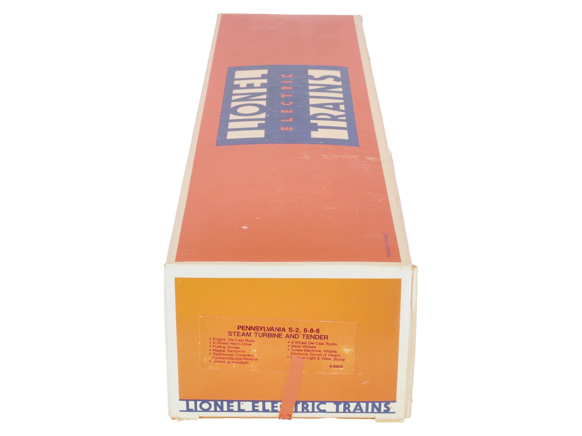 This is a Lionel 6-8404 O Gauge PRR 6-8-6 S-2 Turbine Steam Locomotive & Tender #6200 from 1984-85. Features include an 8 flywheel worm drive, an operating smoke unit, Magne-Traction™, transformer controlled forward, neutral and reverse operation, an operating headlight, 6-wheel die-cast metal trucks, metal wheels, an electronic whistle in tender, electronic sound of steam, back-up light and water scoop.