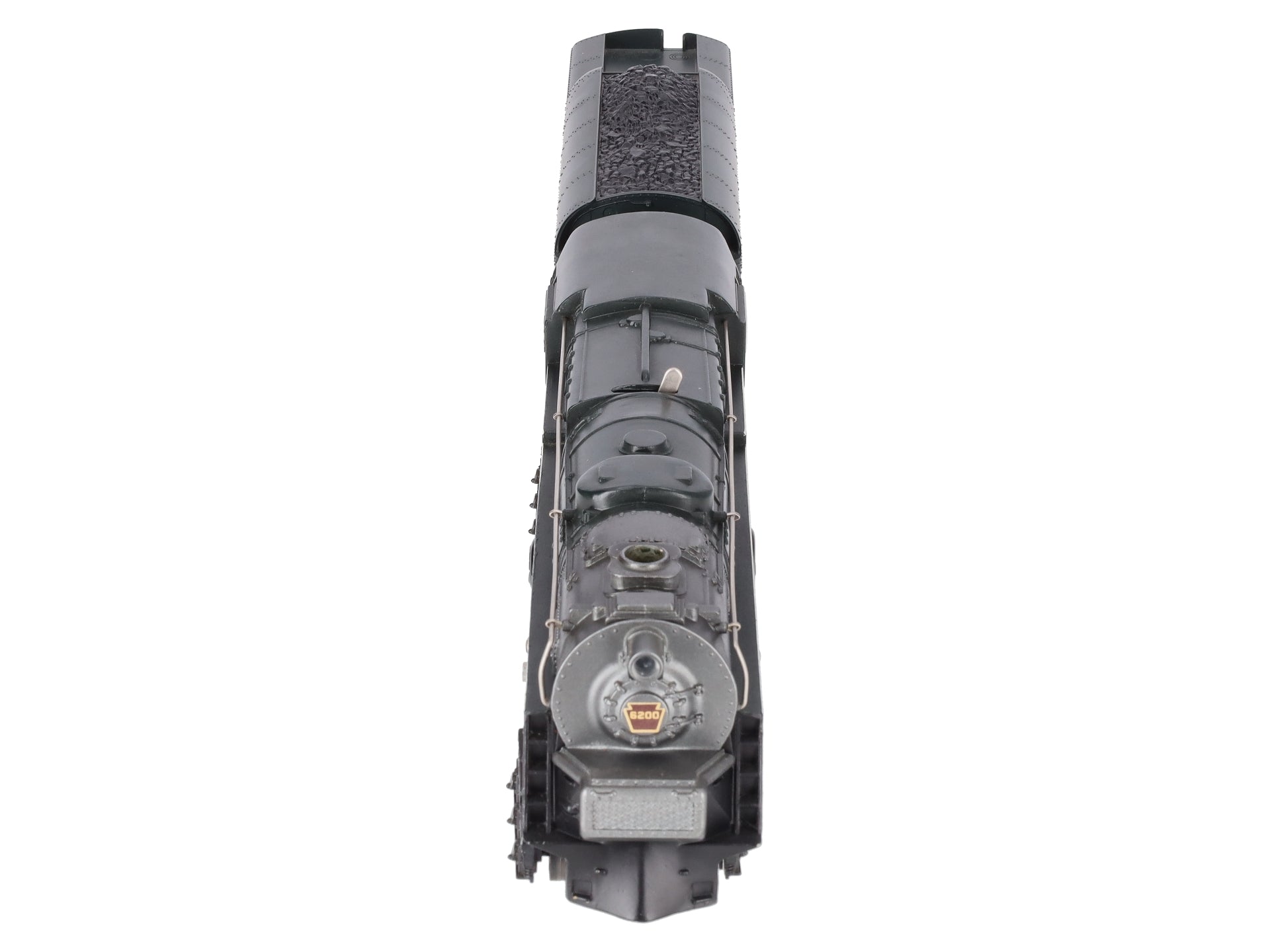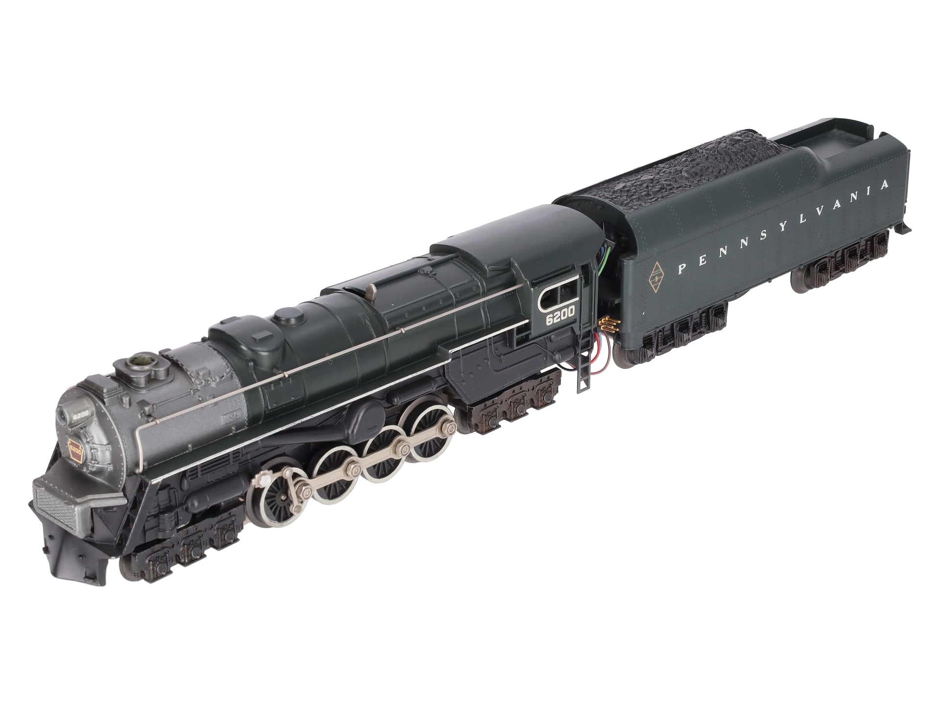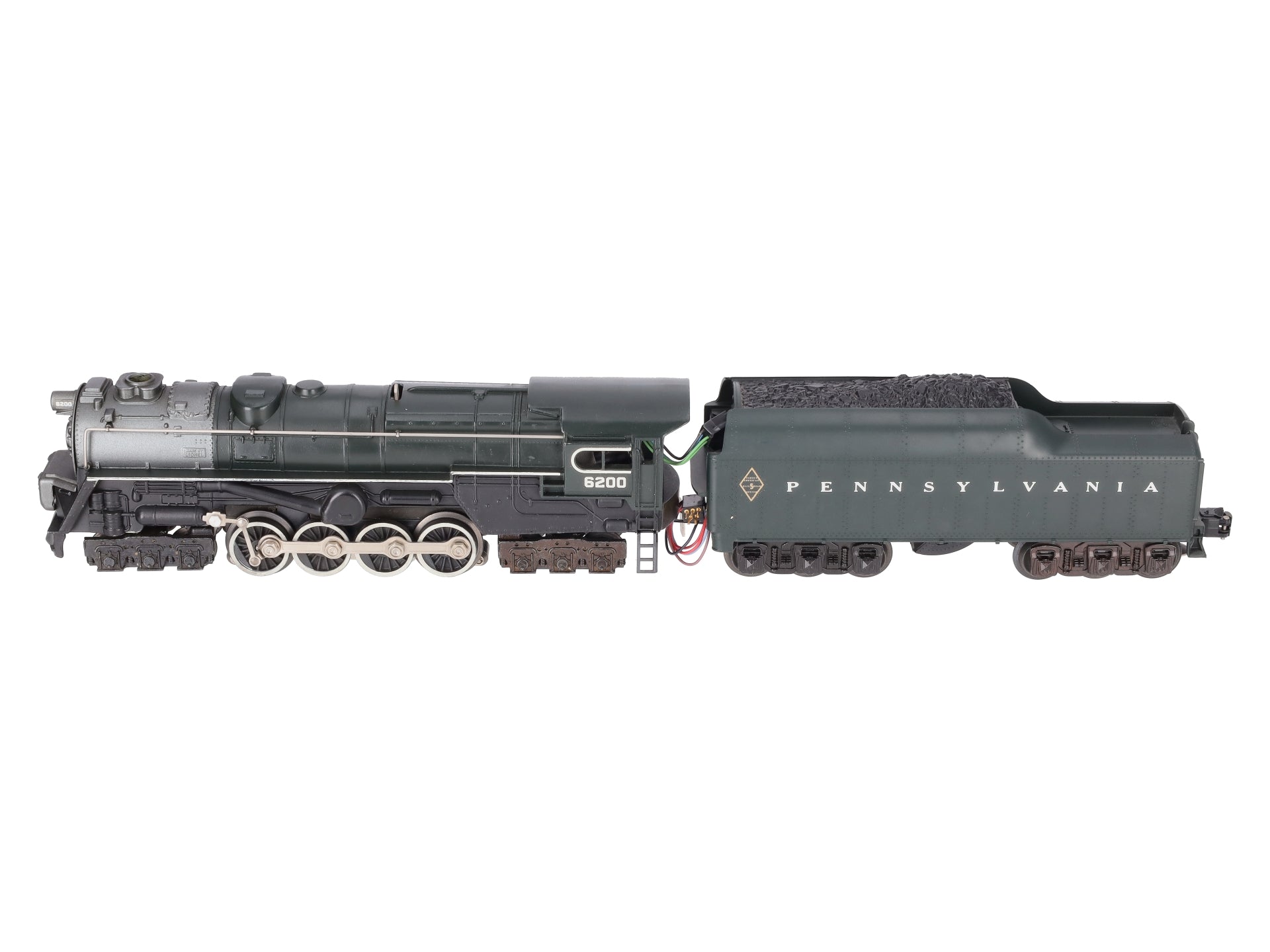 This is a Lionel 6-8404 O Gauge PRR 6-8-6 S-2 Turbine Steam Locomotive & Tender #6200 from 1984-85. Features include an 8 flywheel worm drive, an operating smoke unit, Magne-Traction™, transformer controlled forward, neutral and reverse operation, an operating headlight, 6-wheel die-cast metal trucks, metal wheels, an electronic whistle in tender, electronic sound of steam, back-up light and water scoop.