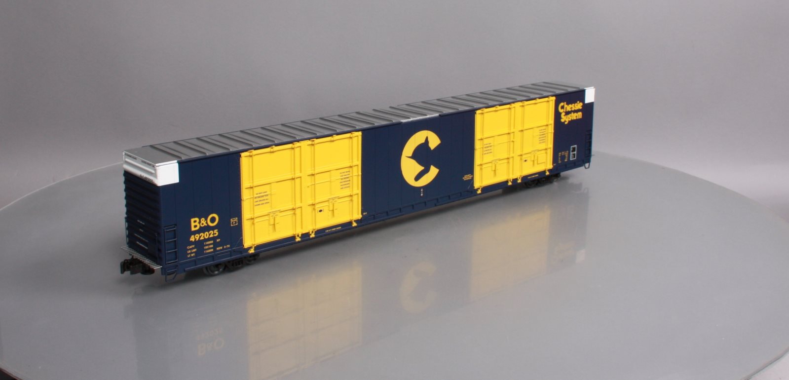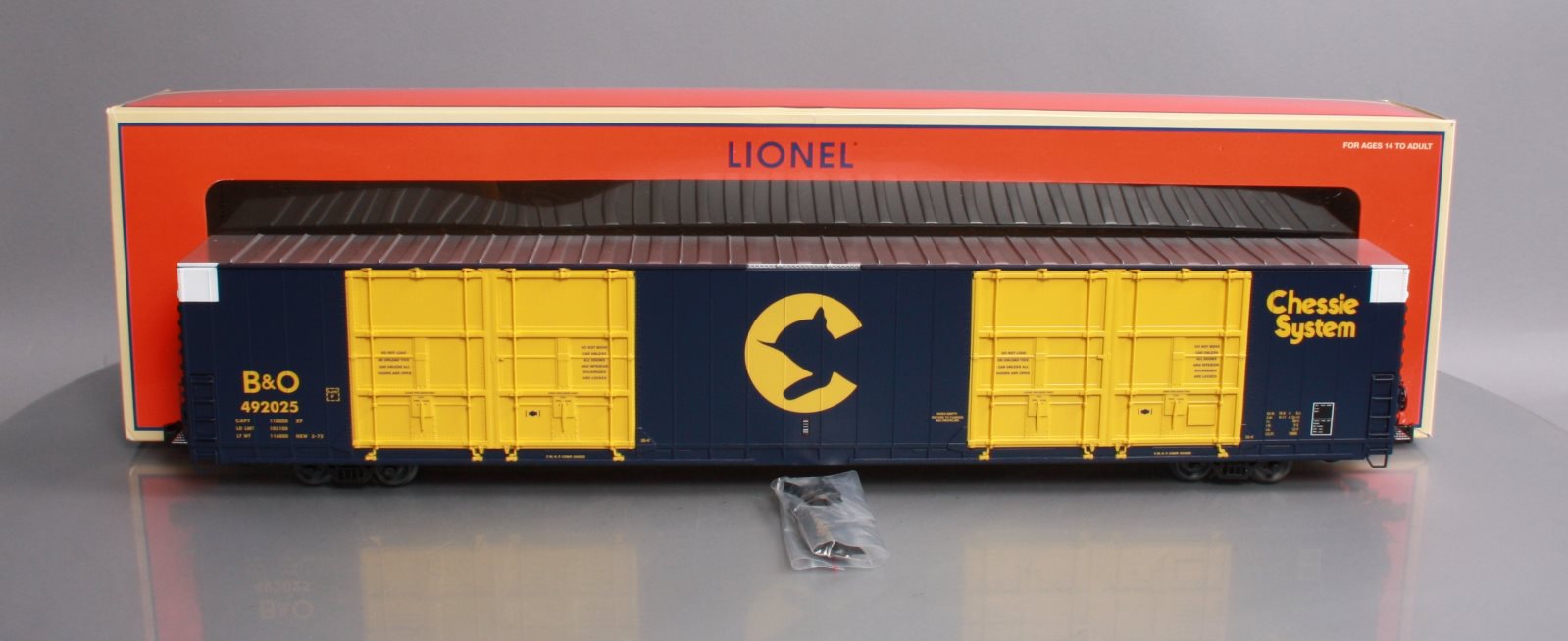 This is a Lionel 6-82424 O Gauge Chessie System Baltimore & Ohio 8-Door HI-Cube Boxcar #492025. Built originally in the 1960's, 86' Hi-cube boxcars are still a colorful sight on the railroads today. In addition to the centered 4-door version already released, Lionel now offers an all-new 8-door configuration featuring two split sets of doors on each side of the boxcar. Equipped With specially designed couplers that adjust around curves, these long and realistic cars are suitable to run on curves as tight as O54.