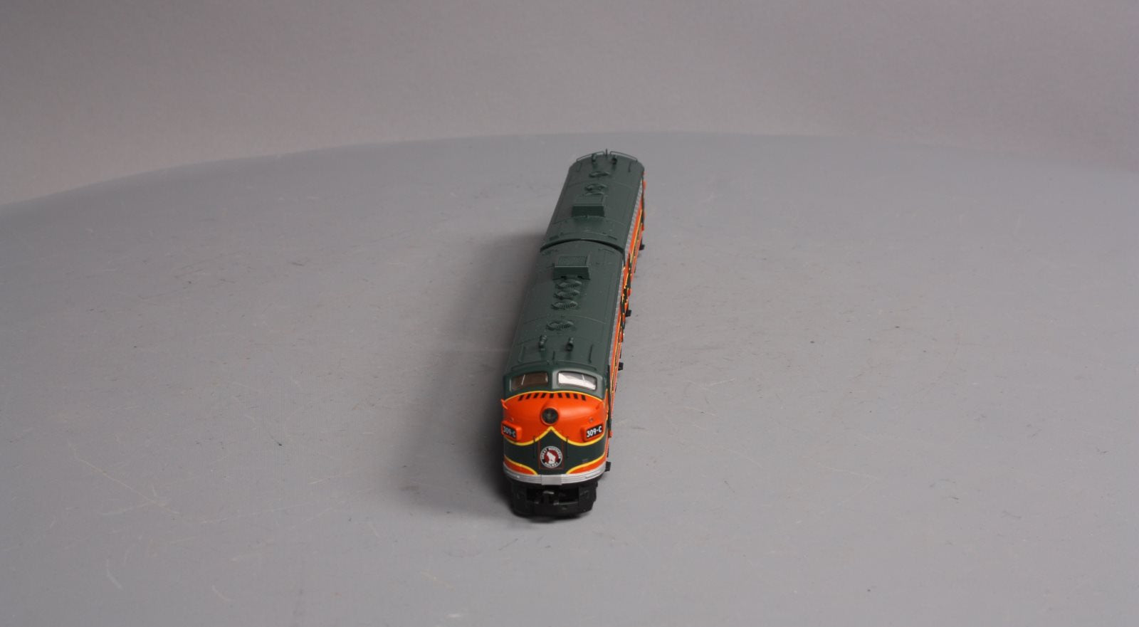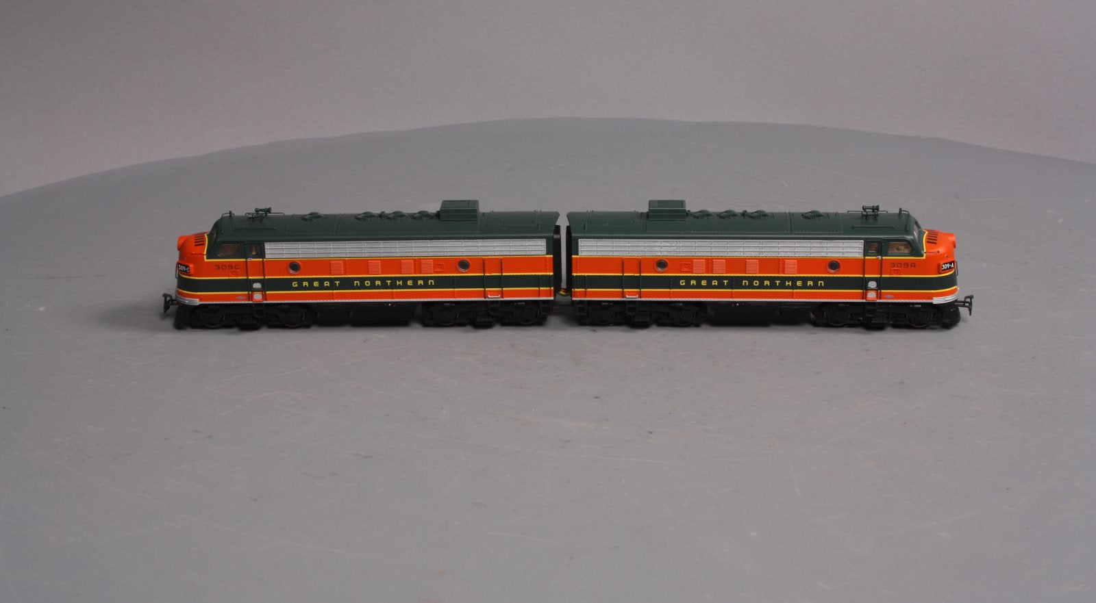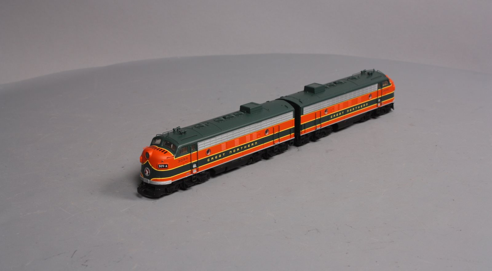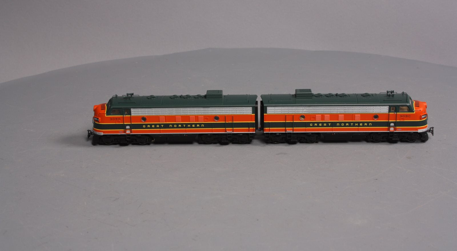 This is a Marklin 39621 HO Great Northern F7 A/A Diesel Electric Loco MFX+ w/Sound. Features the locomotive has an mfx+ digital decoder and extensive sound functions. It also has controlled, high-efficiency propulsion in both A units. 2 axles powered in each A unit. Traction tires. The headlights change over with the direction of travel, will work in conventional operation, and can be controlled digitally. The lighted number boards and the classification lights change over with the direction of travel, will work in conventional operation, and can be controlled digitally. Maintenance-free, warm white LEDs are used for the lighting. The cabs have interior details. The locomotive has separately applied metal grab irons. There is a permanent drawbar between the locomotive units. Snowplows are included. Length over the couplers approximately 35 cm / 13-3/4.