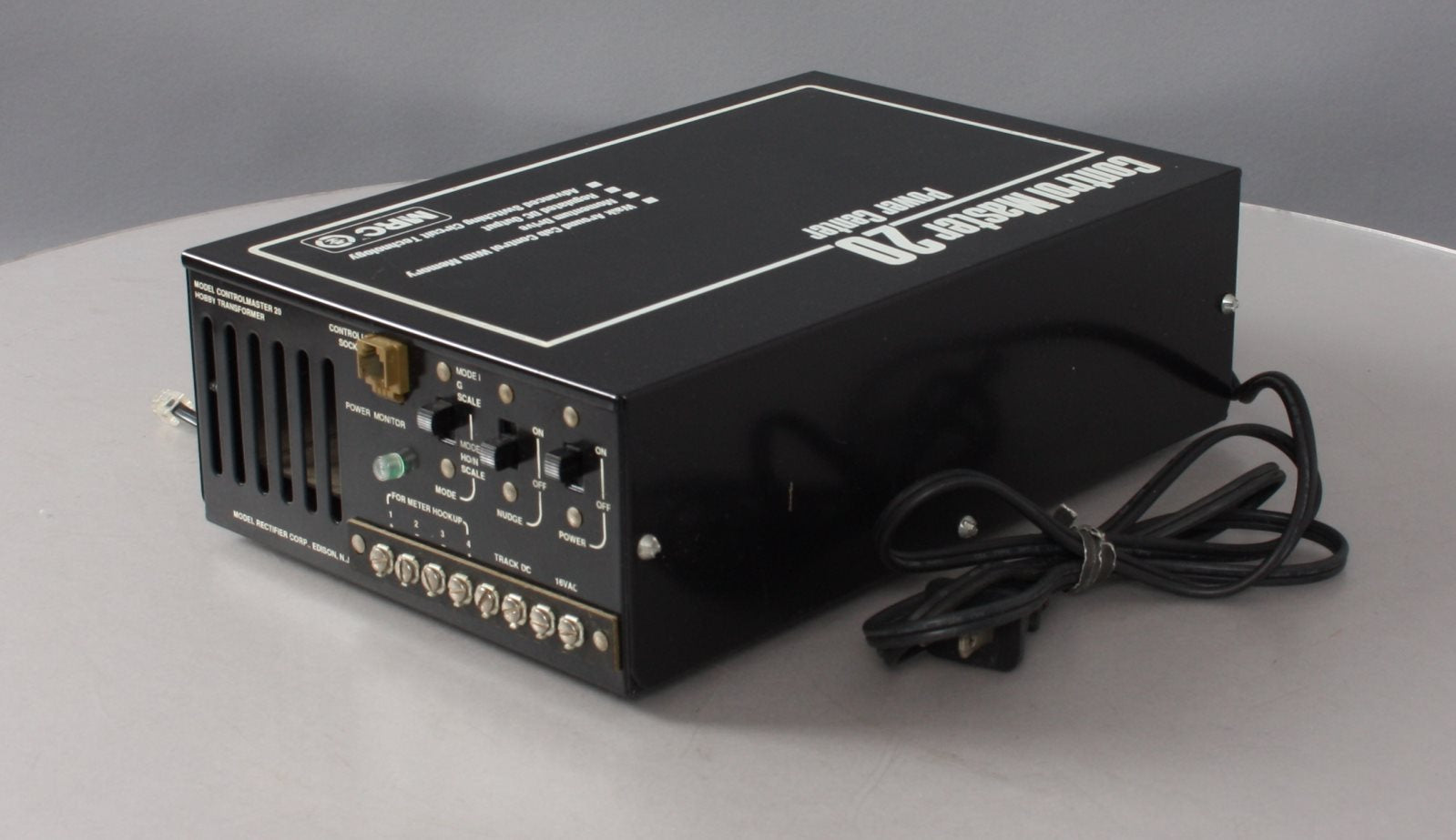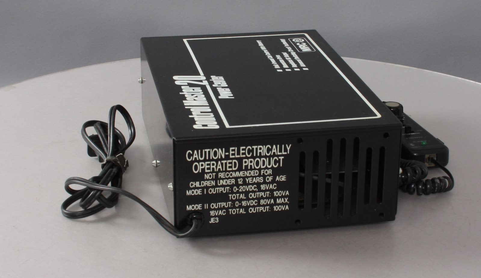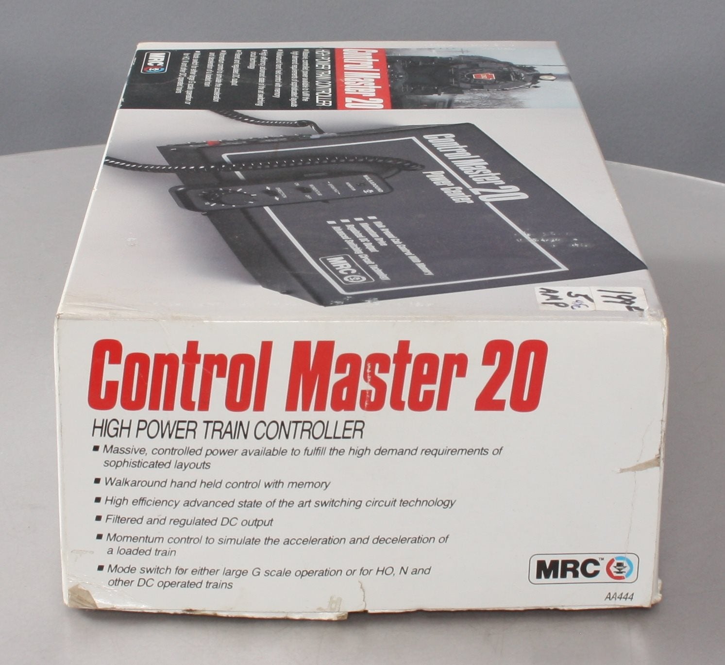 This is a MRC AA444 G Control Master 20 Power Supply 100VA. Runs HO, N, G and other large scale DC Trains. The steady power of flat line DC treats even your most sensitive motors with kid gloves. Keeps them running cool while it gives you maximum power. Voltage regulation helps your locos climb steep grades and sail around curves with virtually no hesitation. Features for this unit include: Memory keeps the train moving when you unplug the handheld throttle to move to another location, Mode switch setting for high output voltage needed for G gauge, Momentum control switch, Direction control switch, Walk-around with 15’ coil cable, Pump-action brake, Nudge switch for smooth, even starts, and a 5-year limited warranty.