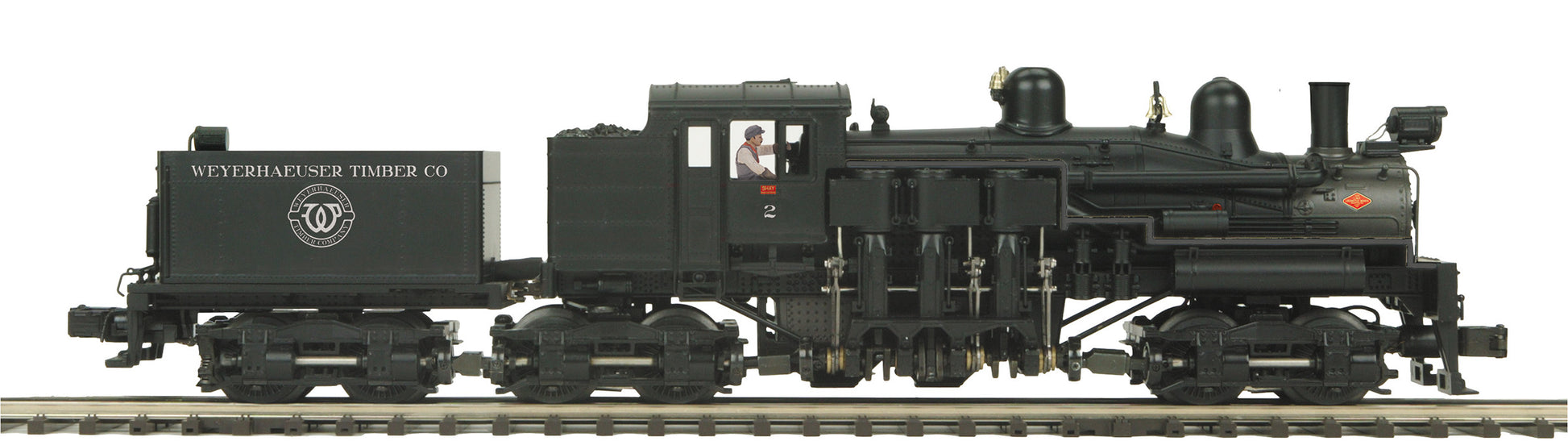 This is a MTH 20-3879-1 O Scale Weyerhaeuser 3-Truck Shay Steam Engine with Proto-Sound 3.0 #2. Features: Intricately Detailed, Die-Cast Boiler and Chassis, Intricately Detailed, Die-Cast Tender Body, Authentic Paint Scheme, Real Tender Coal Load, Die-Cast Locomotive Trucks, Hand painted Engineer and Fireman Figures, Painted Cab Backhead Gauges, Legible Builders Plates, Metal Handrails, Whistle and Bell, Tender Truck Chains, Metal Wheels and Axles, Remote-Controlled Proto-Coupler, Prototypical Rule 17 Lighting, Operating LED Firebox Glow, Operating Tender LED Back-up Light, Powerful 5-Pole Precision Flywheel-Equipped Motor, Synchronized Puffing ProtoSmoke System, Steaming Quillable Whistle, Locomotive Speed Control In Scale MPH Increments, 1:48 Scale Dimensions, Onboard DCC/DCS Decoder, Proto-Sound 3.0 With The Digital Command System Featuring Quillable Whistle With Freight Yard Proto-Effects, Unit Measures: 20 1/2 x 2 7/16 x 4 1/16.