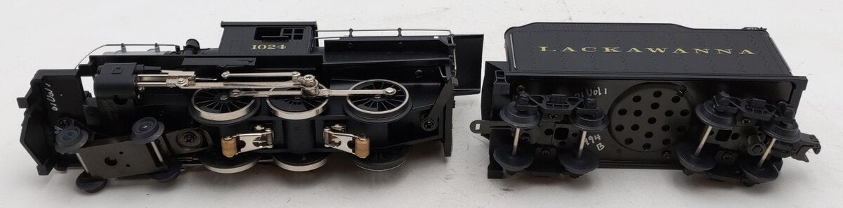 This is an MTH 30-1179-1 Erie Lackawanna 4-6-0 Camelback Steam Locomotive. Features for this locomotive include flywheel equipped motor, operating Proto-Smoke system, die-cast metal trucks, die-cast boiler and tender body, metal wheels and axles. It weighs approximately 7 pounds and measures approximately 18“ long.