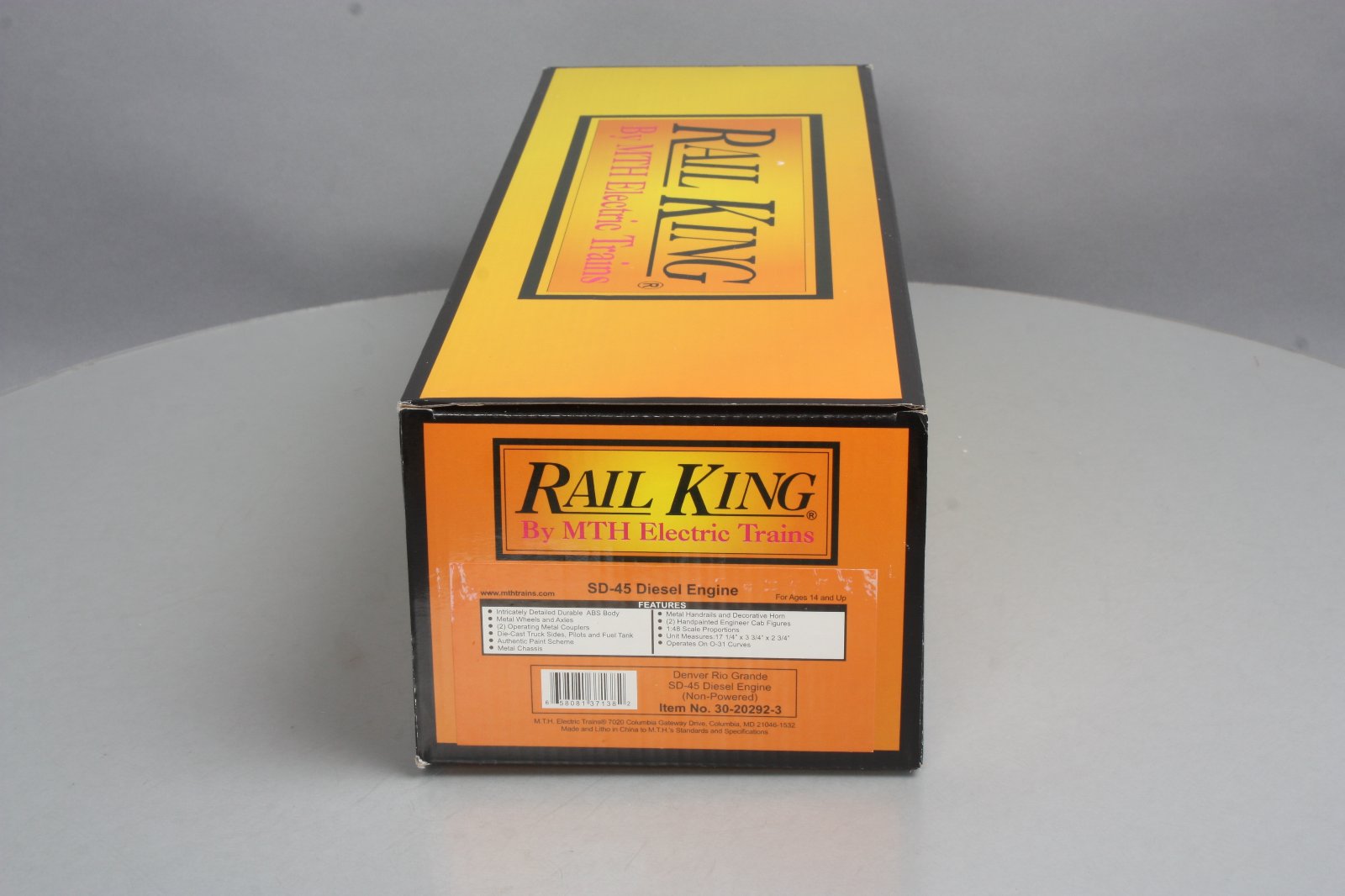 This is an MTH 30-20292-3 O Denver & Rio Grande SD-45 Diesel Engine (Non-Powered). This features Intricately Detailed Durable ABS Body, Die-Cast Truck Sides, Pilots and Fuel Tank, Metal Chassis, Metal Handrails and Horn, (2) Hand painted Engineer Cab Figures, Authentic Paint Scheme, Metal Wheels and Axles, (2) Operating Metal Couplers, 1:48 Scale Proportions, Unit Measures: 17 1/4 x 3 3/4 x 2 3/4, Operates On O-31 Curves.