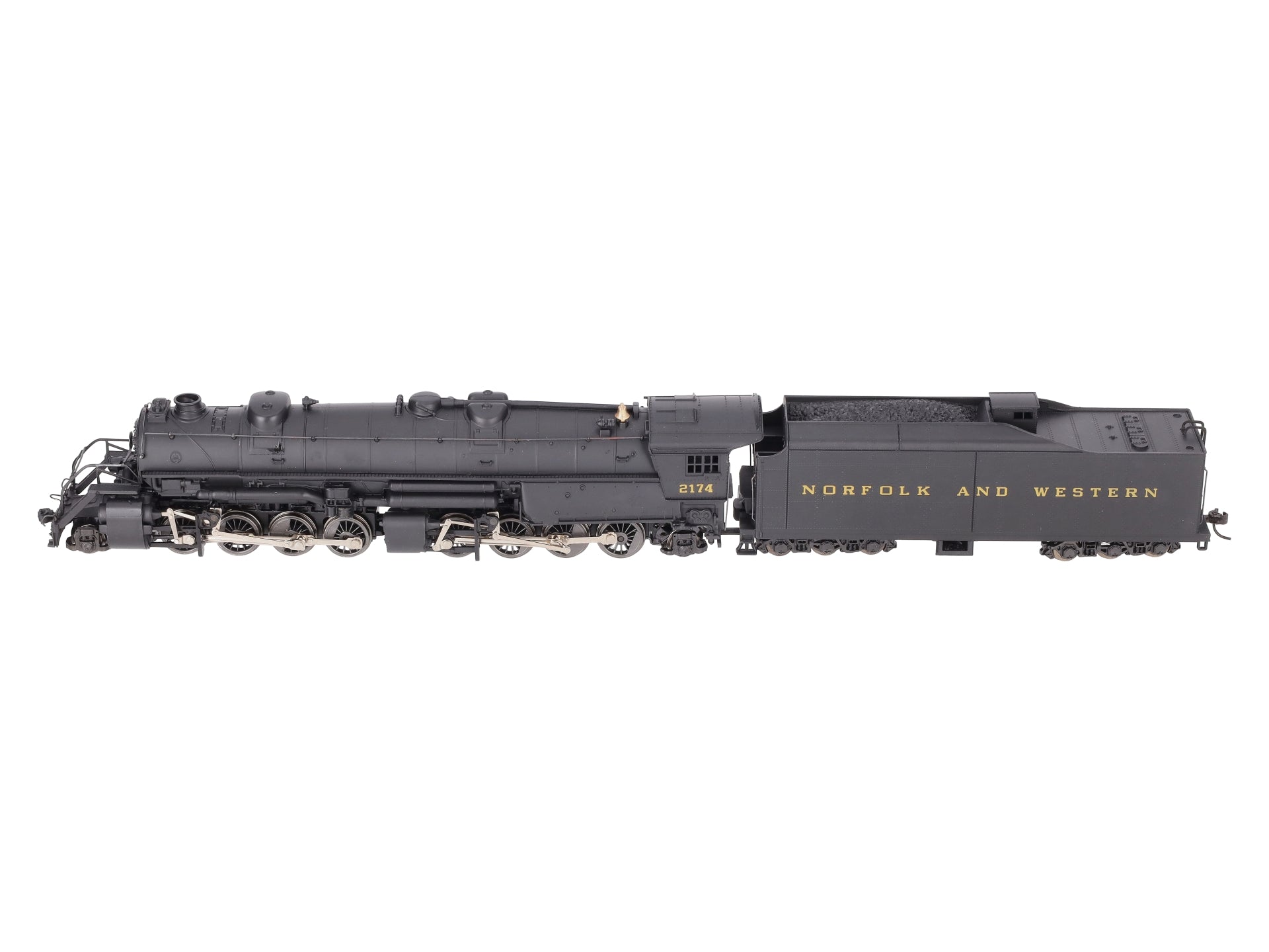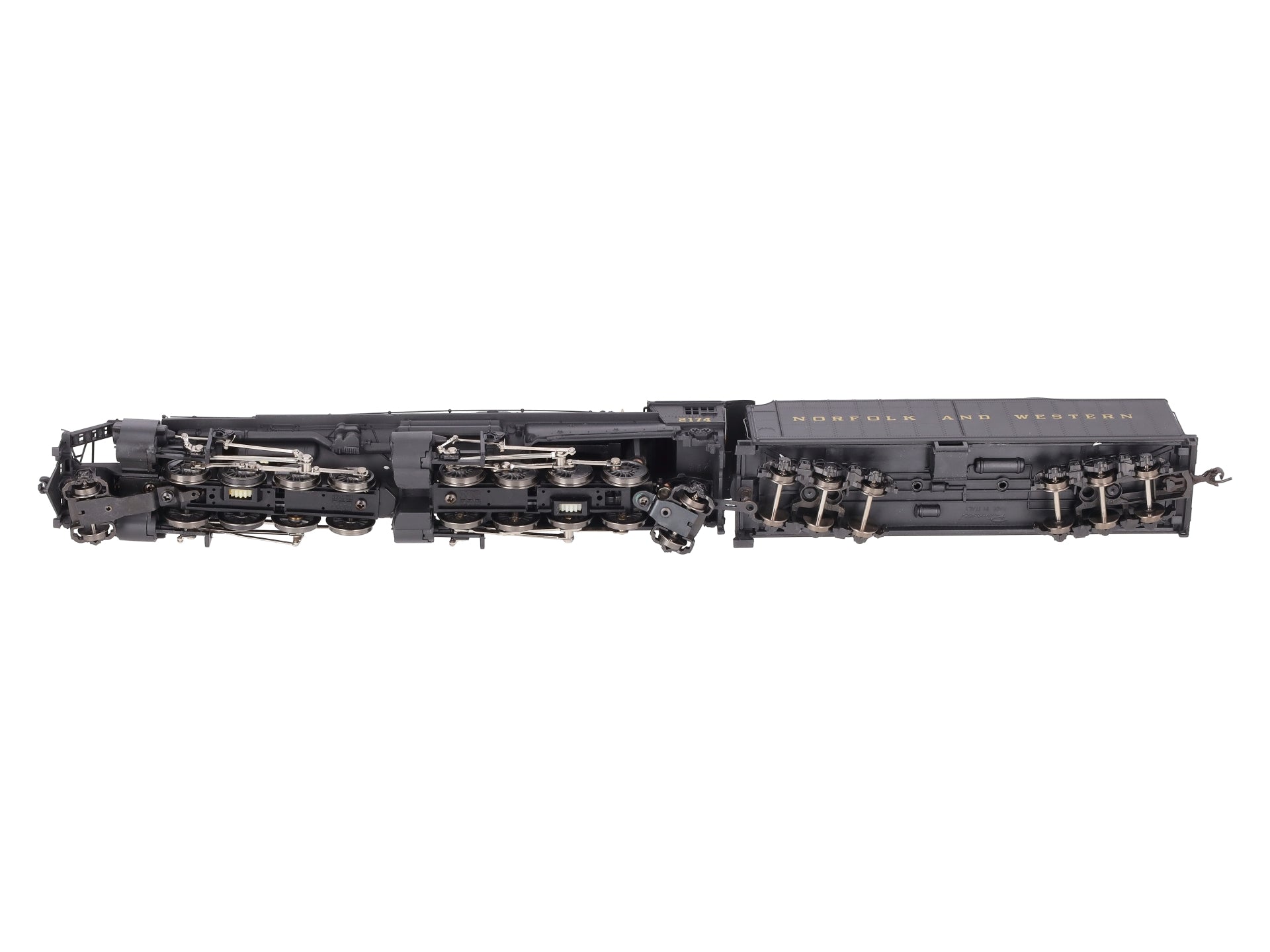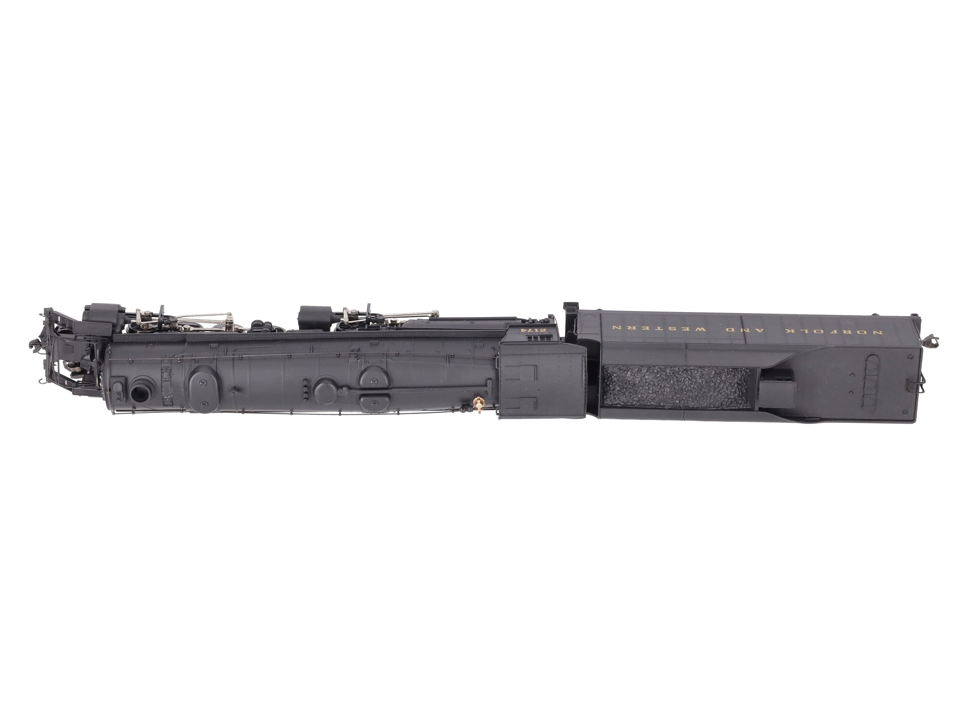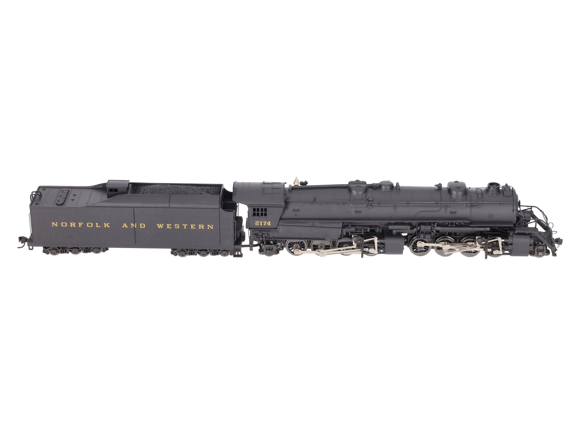 This is a Rivarossi 1593 HO Norfolk and Western Mallet Y6B Locomotive and Tender. Features include motor, plastic construction, plastic trucks, metal side rods, metal wheels, and plastic operating knuckle couplers.