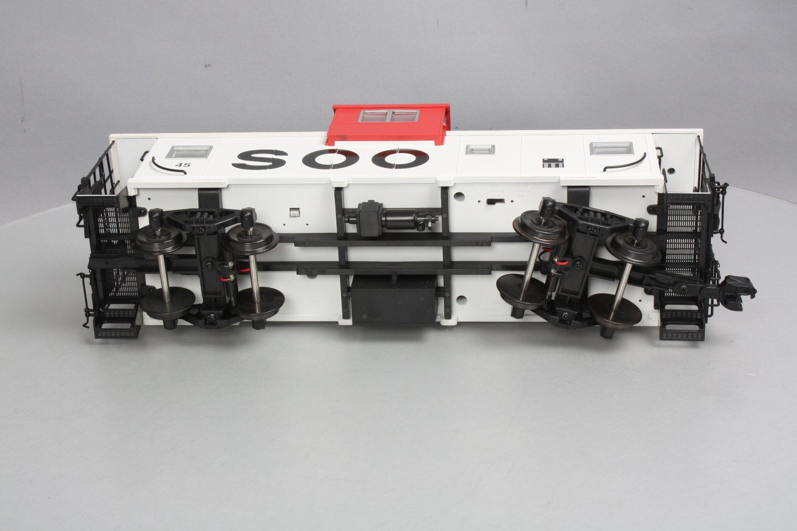 This is a USA Trains 12120 G Soo Line Extended Vision Caboose #45. Feature battery-charging circuit for flashing ETD light on rear (included), interior lighting, quality graphics and metal wheels, handrails and ladders.