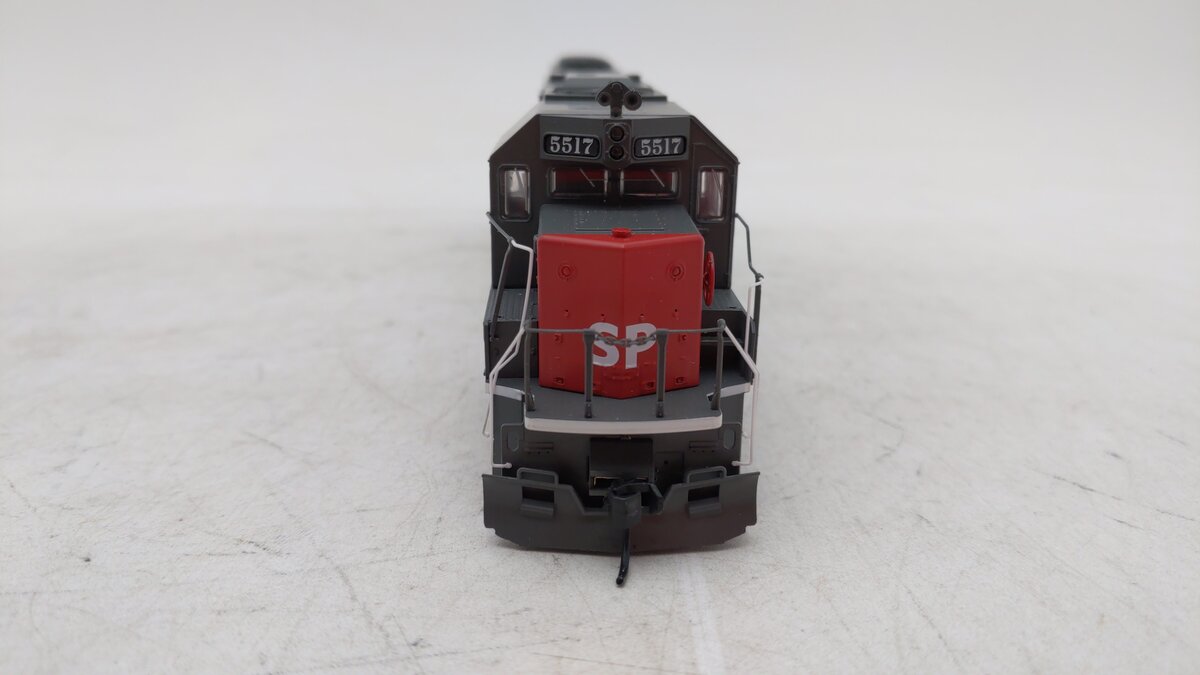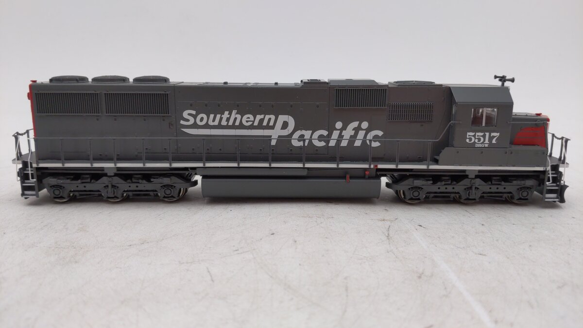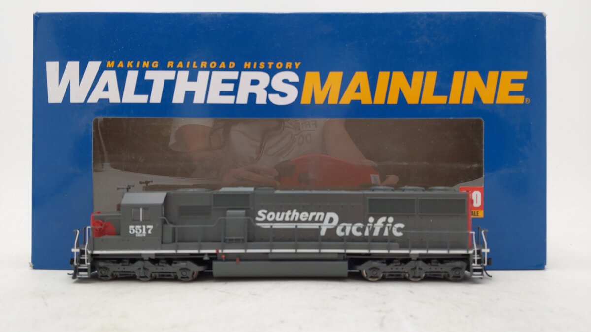 This is a Walthers 910-10360 HO Scale Southern Pacific EMD SD50 Diesel Locomotive Standard DC #5517 (gray, red, white; Speed Lettering). This WalthersMainline EMD SD50 is perfect for heavy freight service on your HO Scale railroad. As demand for higher-horsepower units and better fuel economy continued to grow in the late 1970s, EMD began testing a new six-axle model in 1979, which entered production as the SD50 in 1981. Like the prototype, this locomotive is a great addition to your railroad's fleet of heavy diesel road units. The WalthersMainline SD50 has the features you want to make it a star performer on your layout: Limited edition - one time run of these roadnumbers! Prototypes in service 1981 to present with large and small lines, All-new drive including newly tooled power trucks with HT-C sideframes, Revised and corrected dynamic brake intake grilles, Anti-slip detail on walkways, Open grating on steps, Updated Phase Two shell with molded drill starter points for grab irons in EMD SD50-60 Diesel Detail Kit (910-256) sold separately. Same powerful drive as WalthersProto(R) locos featuring: 5-pole skew-wound motor, 14:1 gear ratio, Helical-cut gears for quiet operation and easy multiple unit operation, All-wheel drive and electrical pickup, Dual machined brass flywheels, Heavy die-cast metal chassis, Constant and directional LED headlights,21-pin plug for easy DCC conversion, RP-25 metal wheels, Proto MAX(TM) metal knuckle couplers.