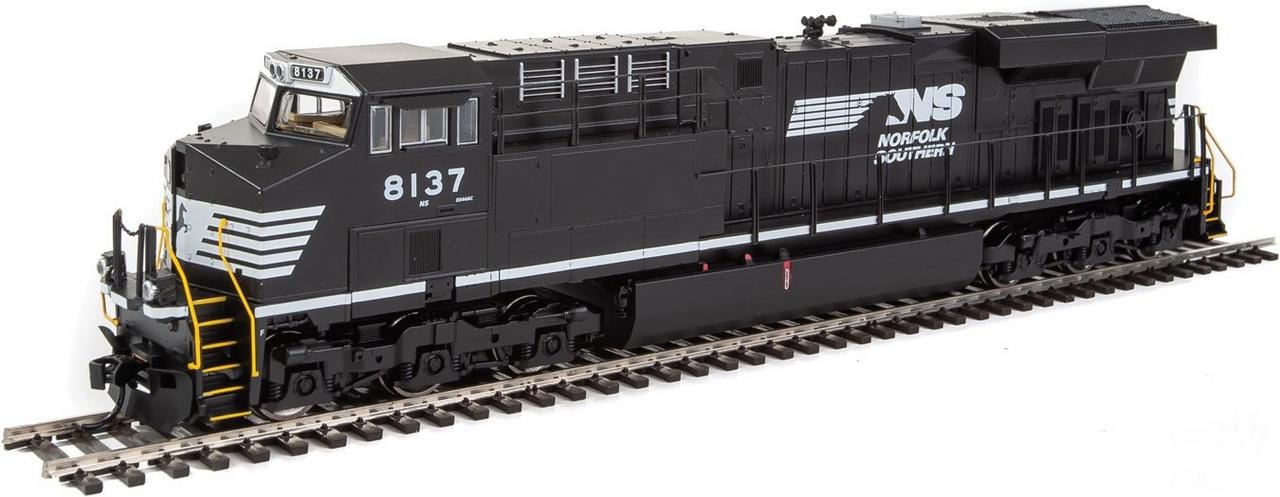 This is a Walthers 910-20180 HO Scale Norfolk Southern ES44AC GE Evolution Series GEVO Diesel Locomotive ESU(R) Sound and DCC #8137 (black, white; Horse Head Logo). GE ES44 Evolution Series GEVO diesels feature: Limited edition - one time run of these roadnumbers! Model today's railroading at WalthersMainline prices, The most popular prototype diesel in North America, Thousands in service from 2003 to the present. ESU Sound for DCC and DC layouts featuring: 4 function outputs with brightness control by CV, Fully DCC compatible, 14, 28, 128 speed steps, Dual mode DC and DCC, 4 air horns changeable by CVs, 2 bells changeable by CVs, Full 8-notch prime mover sounds, Compressor, Dynamic brake, Multiple realistic lighting effects, 21-pin DCC plug, 2- or 4-vent dynamic brake vent as appropriate, Easily handles 18 radius curves (22 or larger recommended), Six powered axles per unit, LED Lighting includes: -Correct headlight position per prototype & Working front ditch lights, Three truck styles to match prototypes: Standard high-adhesion, Steerable, C4 A1A center idler axle. Same powerful drive as WalthersProto(R) locos featuring: Five-pole skew-wound motor, 14:1 gear ratio, Helical-cut gears for quiet operation and easy multiple unit operation, All-wheel drive and electrical pickup, Dual machined brass flywheels, Heavy die-cast metal chassis, Constant and directional LED lights. Correct profile radiator grilles and rooftop walkway surface details, Molded drill starter points for grab irons - easily added with the GE ES44 Evolution Series Diesel Detail Kit (910-250, sold separately), RP-25 metal wheels, Proto MAX(TM) metal knuckle couplers, Fully assembled.