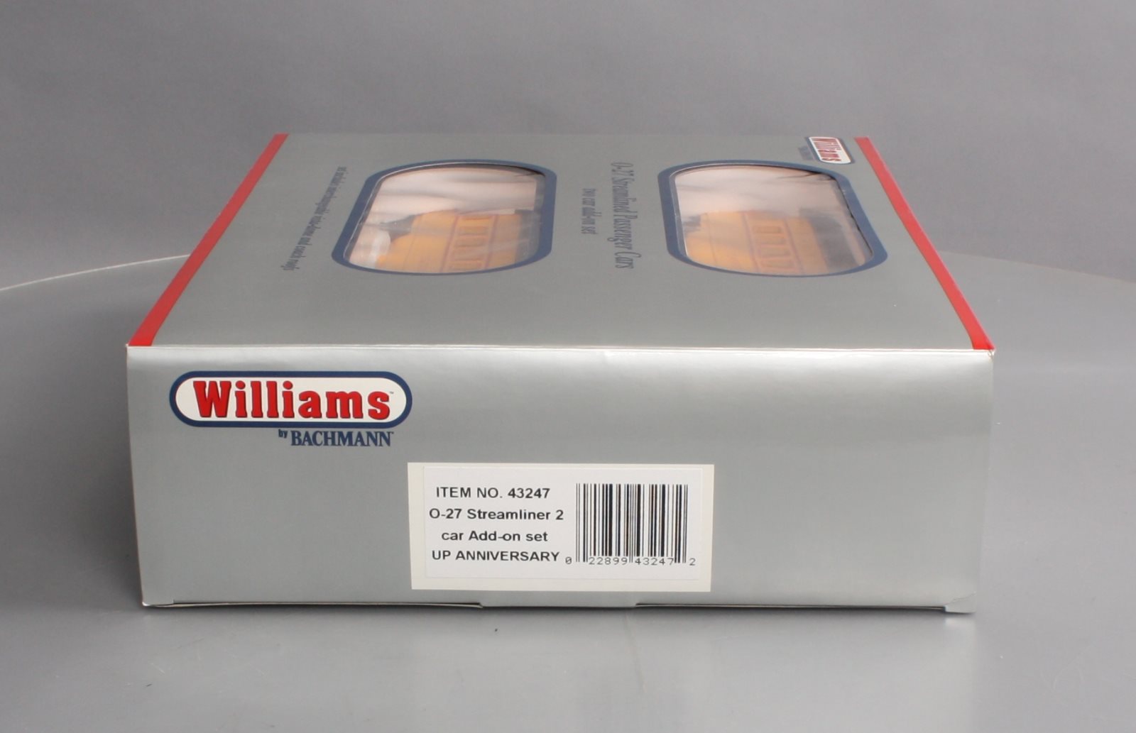 Here is a Williams 43247 Union Pacific streamliner two-car passenger add-on anniversary set. These cars feature: vista-dome and coach roofs, a durable ABS plastic body, passenger silhouettes in window, reproduction trucks, painted graphics, needle point axles with fast-angle metal wheels, die-cast 4-wheel trucks, die-cast operating couplers, dual lights, and removable roofs for easy bulb replacement. Each car measures approximately 12 inches. Bachmann Industries, Inc. is an official licensee of Union Pacific and is authorized to use trademarks owned and/or registered by Union Pacific. The Union Pacific and the Union Pacific shield are registered trademarks used under license.